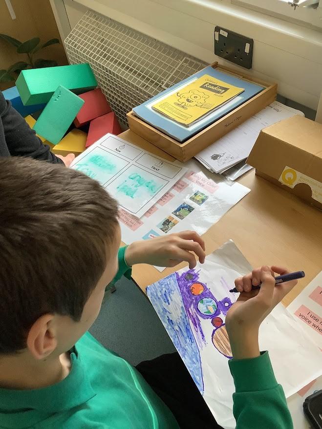 Flair class have blasted off into space for our Spring term topic. Travelling through the solar system and beyond. We’ve used all our senses to explore alien worlds in ‘An Alien Planet’, our sensory story for this term. We’ve practiced rolling and kicking space blankets in Physical Development, turned the stars on and off in Cognition and Challenge and made many moonscapes in Creativity! The pupils have enjoyed relaxation sessions under our star projectors, and explored Gustav Holst’s ‘The Planets’ in music. Some pupils have used eye-gaze to communicate the order of the planets in our solar system and we’ ve explored gravity defying rocket ships in Sensory Science. We’ve had fun on the moon in Messy Play and explored ‘Explosions in Space’ sensory boxes. We’ ve listened to many space themed songs and stories, but always enjoy coming back down to Earth with a countdown!