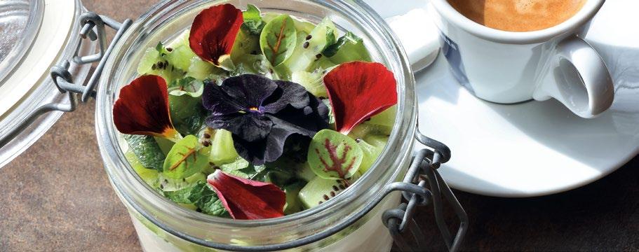 • Pour le dressage : dans un petit pot à conserve type “Le parfait” (ou dans un verre assez large), mettre 1 biscuit cuillère coupé en 2, préalablement trempé dans le coulis de kiwi. Déposer 2 cuillères à soupe d’appareil tiramisu dessus. Renouveler l’opération pour créer un deuxième étage dans le même pot. Terminer avec 2 cuillères à soupe de kiwis coupés en petits dés et quelques feuilles de menthe hachées.