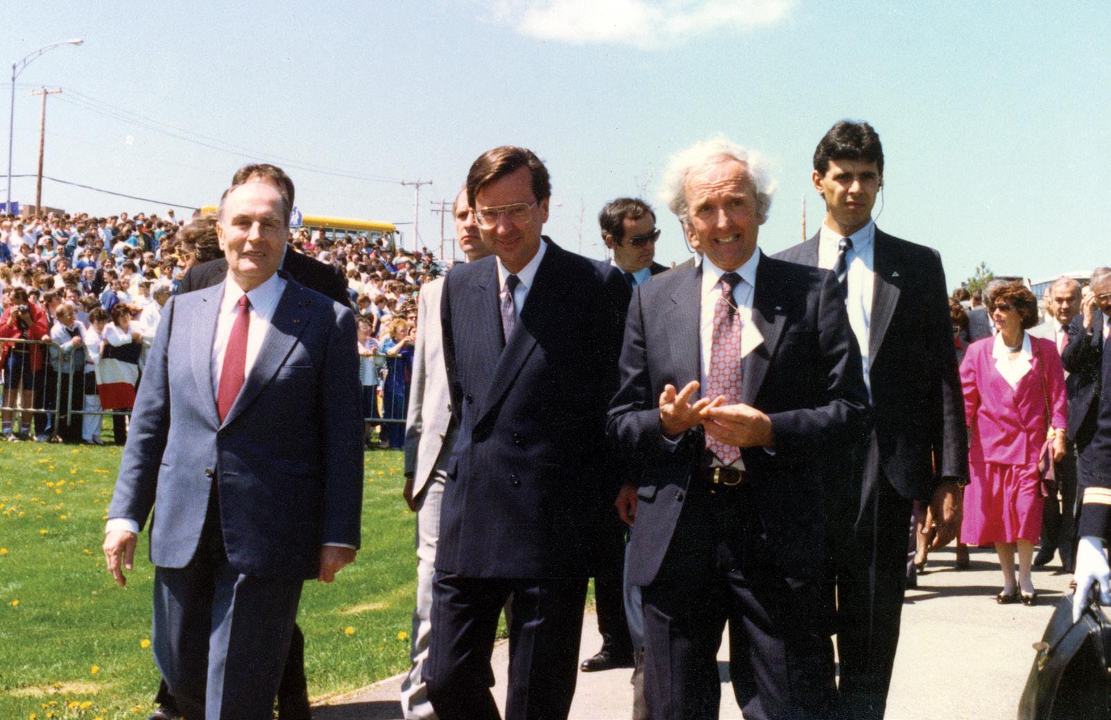 De gauche à droite : le président de la République française François Mitterrand, le premier ministre du Québec Robert Bourrassa et le président du Musée de la Gaspésie Jules Bélanger, 1987. Derrière eux, on aperçoit les gardes du corps. Musée de la Gaspésie. Fonds Musée de la Gaspésie. P1/7/3