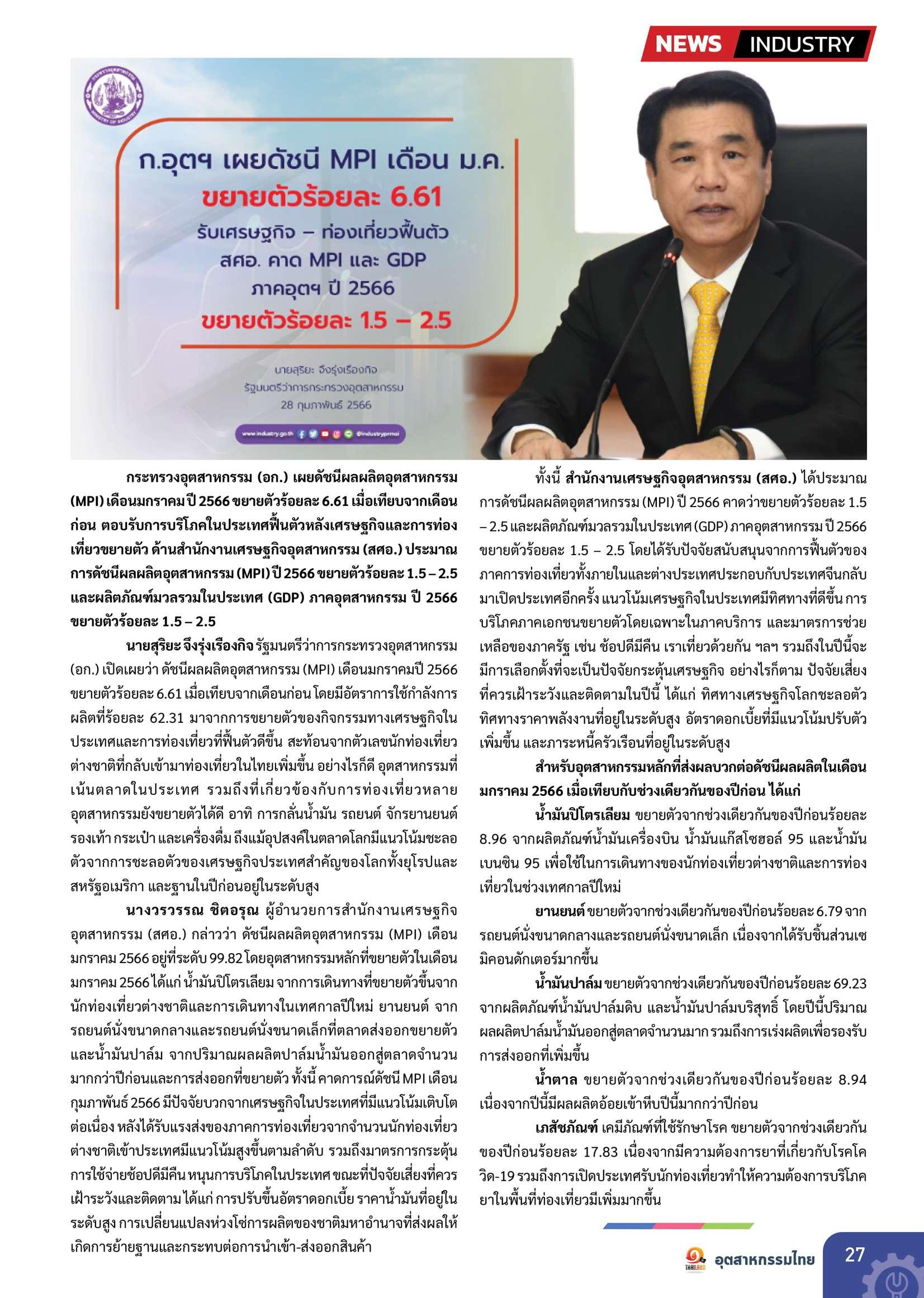 THAILAND INDUSTRY MARKET แนะนำ�สิินค้้�และบริิก�ริต่่�งๆ UPDATE! 2023 ในแวดวงอุุต่สิ�หกริริม ..................................... 43 บริษัท กิตวรินทร์ อาร์ตแอนด์มีเดีย จ�ำกัด ส�ำนักงำน 32/67 ถ.สุขุมวิท ต.ปำกน�้ำ อ.เมือง สมุทรปรำกำร 10270 0-2380-3709-10 magazine1nai@gmail.com www.magazine1nai.com magazine1nai 1Nai Thailand ผู้ให้บริกำรโฆษณำ ฉบับพิเศษ : ไทสมุทรเดลี่ สารบัญ > เรื่่องจากปก MIND ใช้้ หััว และ ใจ ปั้้นอุุต่สิ�หกริริมค้ชุุมชุน 08 > เปั้ิดแผนอุุต่สิ�หกริริมปั้ 66 ฝ่่�เศริษฐกิจโลกหลังภ�วะโค้วิด ..................... 20 > ข่่าวสารื่อุุต่สิ�หกริริม .................................... 27 > ทำำ�ค้ว�มริ่้จัก “นอุต่” และ “สิกริ่ ” โดย คุ้ณศริวิกริณ จินทำริักษ � 33 > HOTLINE สิ�ยด่วนอุุต่สิ�หกริริม ............. 36 ต้้อน รัับปีีใหม่่ ๒๕๖๖ ด้้วยสถานการณ์์โควด้ที่่�ผ่่อน คลายสถานการณ์์ลง กระที่รวงสาธารณ์สุข ประกาศยกเลิกโควด้-19