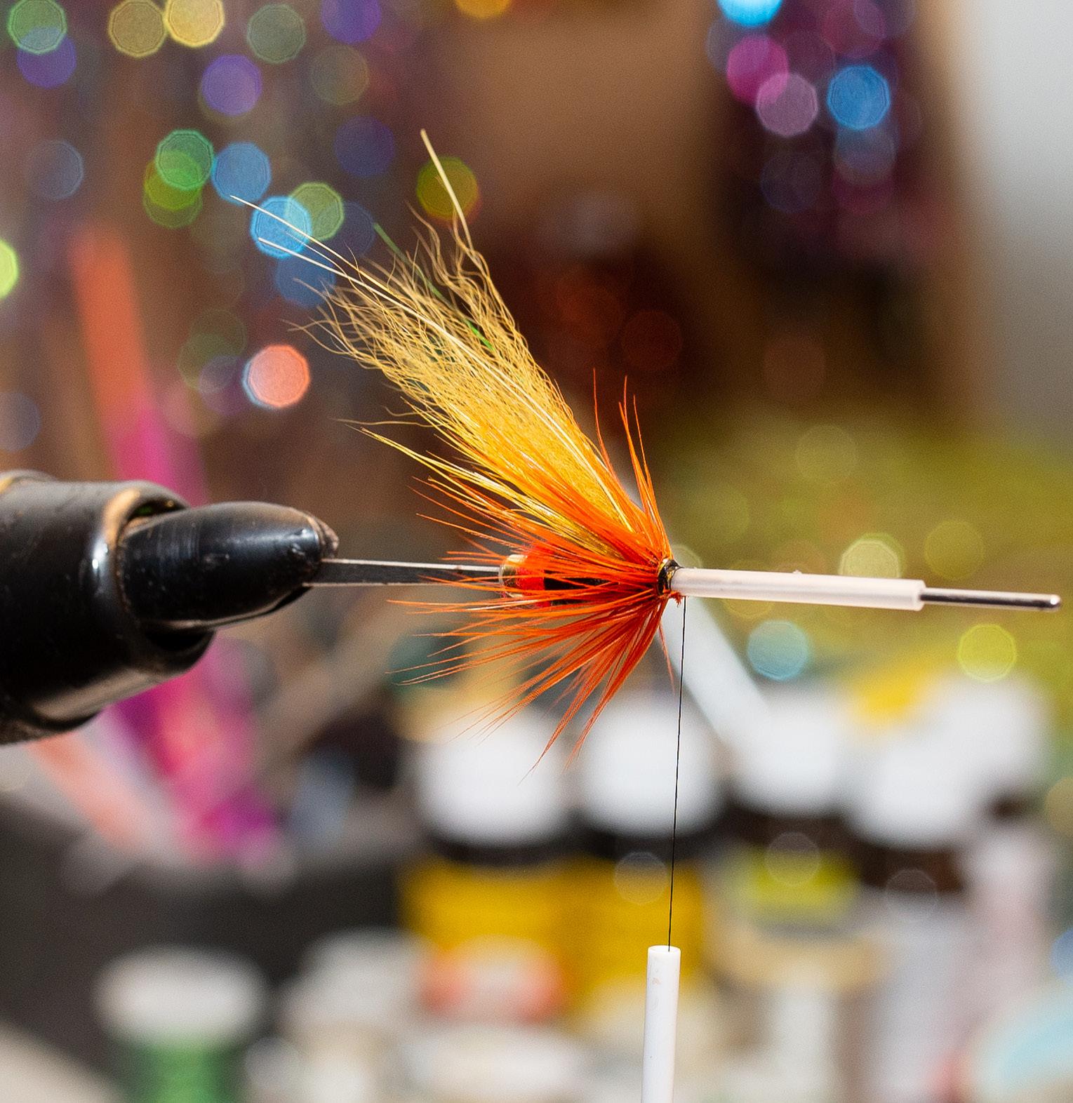 – Hemligheten med en bra laxfluga är att vingarna är taperade på rätt sätt så att de ”simmar” på rätt sätt i vattnet. De laxflugor jag binder har oftast tre vingar i olika längd, varje vinge är individuellt taperad, vidare så är vingarna i förhållande till varandra också taperade, detta är oerhört viktigt tillsammans med att utnyttja bindtråden fullt ut. Jag menar att kunna dra åt så mycket som bindtråden tål utan att den brister, då behöver jag inte använda så många bindtrådsvarv, varje varv bygger ju i volym. Dessa två sakerna är kanske det som ”vanliga” flugbindare upplever som en svår del i laxflugbindningen.