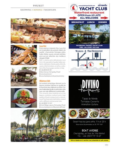 Albatross Cafe Cet endroit romantique donnant sur la lagune combine fraîcheur et qualité de la nourriture pour déjeuner ou dîner. Cuisine thaïlandaise locale et petits plats créés avec une note différente et personnelle. This romantic place looking out on the lagoon combines coolness and a high quality of food to enjoy lunch or dinner. Local Thai food and small dishes created with a different and personal note. +66 (0)898 732 829 Canal Village, Laguna, Cherngtalay, Phuket www.facebook.com/AlbatrossCafePhuket