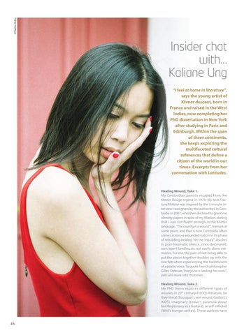 Insider chat with... Kaliane Ung “I feel at home in literature”, says the young artist of Khmer descent, born in France and raised in the West Indies, now completing her PhD dissertation in New York after studying in Paris and Edinburgh. Within the span of three continents, she keeps exploring the multifaceted cultural references that define a citizen of the world in our times. Excerpts from her conversation with Latitudes.