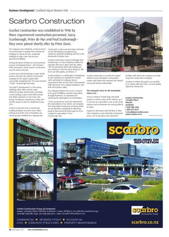 Scarbro Construction Scarbro Construction was established in 1996 by three experienced construction personnel, Garry Scarborough, Peter de Nys and Paul Scarborough – they were joined shortly after by Peter Davis. The company now celebrates a track record of successful projects ranging from commercial buildings to interior fit-outs, residential buildings to large scale concrete and apartment buildings. Among the latest of these are two prominent projects at Auckland Airport – the Formule 1 Hotel and Quad 5 where Scarbro Construction was the main contractor. Scarbro were selected during an open tender process and were the obvious construction company for the Quad 5 project after successfully completing the 125-room Formule 1 Hotel – located right next door. The Quad 5 development is a four-storey, 4800sqm office block and has some distinctive design characteristics including curtain walling, a green wall trellis system, hub ribbon wall and a 5-star Green Star design. Earthworks commenced in May 2011 and the project is due for completion in July 2012. Scarbro Construction has a commercial building pedigree second to none. When looking around the vista of Auckland, you cannot go past buildings the company has