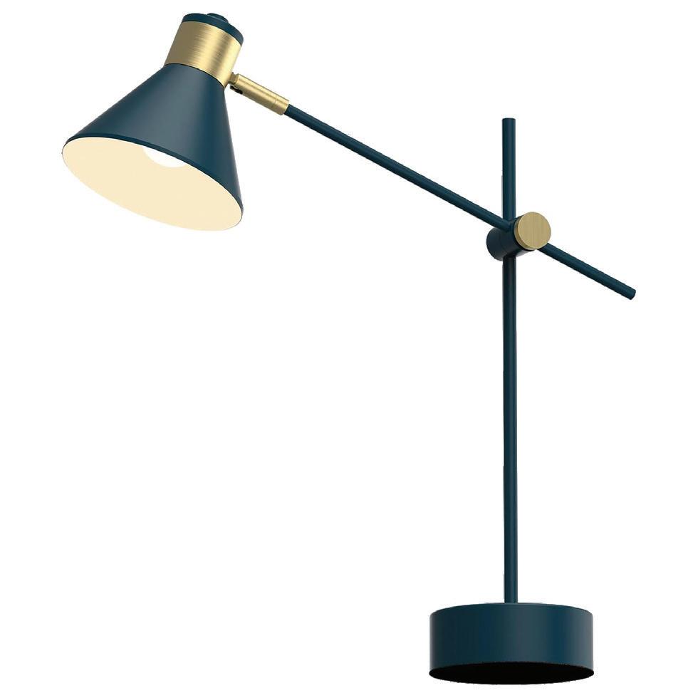 Complete your space with this retro table lamp. Its deep blue metal shade and base, along with brushed brass metalware, are sure to enhance