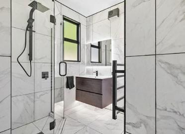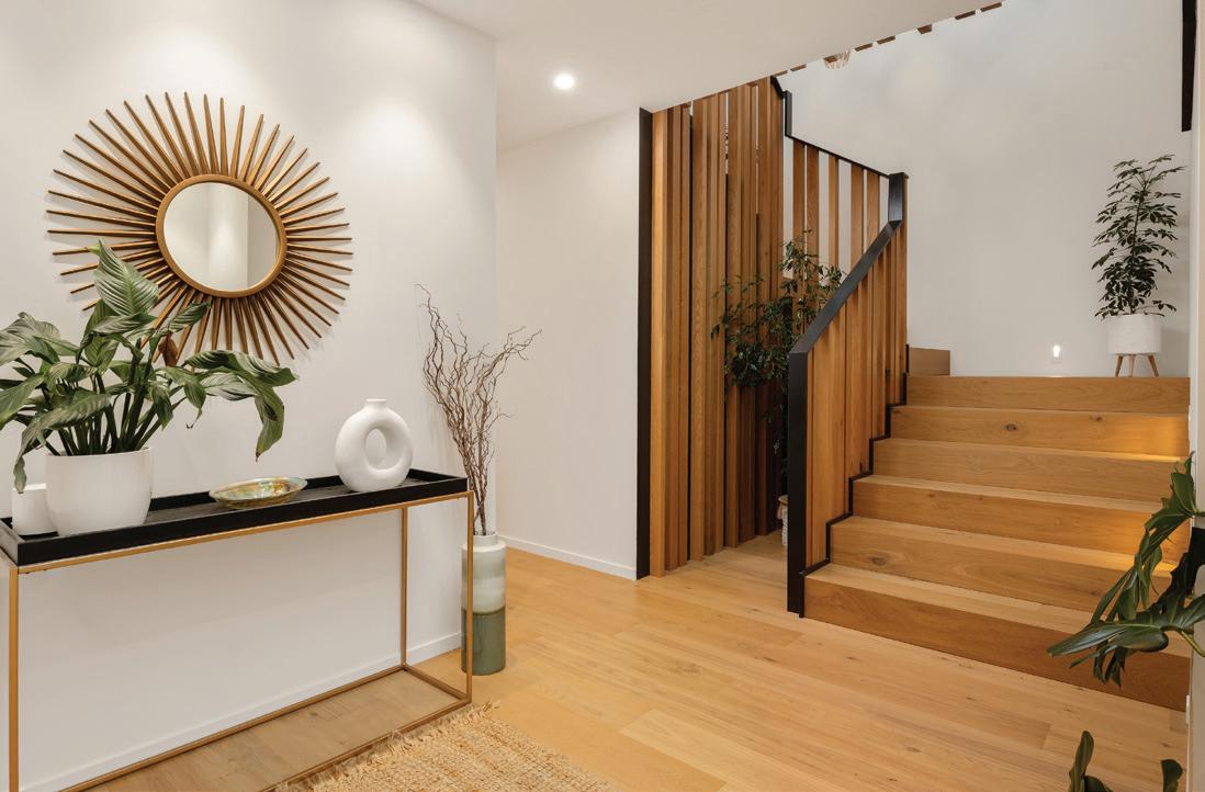 On the first floor, internal sliding stacker doors create a seamless flow from the living areas to a sheltered outdoor room, enhancing both comfort and connection to the landscape. At the heart of the home lies a striking kitchen, illuminated by a slimline skylight that bathes the work surfaces in natural light. This harmonious blend of form and function sets the project apart, earning Roger Hogg Builders welldeserved recognition.