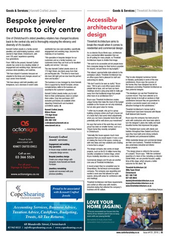 worldwide has now seen jewellery, specifically engagement and wedding rings, become the mainstay of our business. “We specialise in bespoke designs for our customers and as a family business, our customers know they can trust us for excellent quality and service,” she says. The new Kennett Crafted Jewels store is at 175 High Street, one block away from their pre-earthquake site. “The time to move back into town felt right and we now have the perfect store and location.” The business is now managed by Anne Kennett. She is supported by Neroli Fornasier, whose complementary skills to the business are essential to the customer’s experience. Kennett Crafted Jewels invites you to visit them in their contemporary store or contact them online. Duty free purchases (GST excluded purchases) are available when departing Christchurch and Auckland (conditions apply). CT Kennett Crafted Jewels Billens House 175 High Street Christchurch (03) 366 1232 craftedjewels@kennett.net.nz www.kennett.net.nz — Advertising Feature