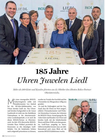 it einer riesengroßen ROLEXGeburtstagstorte stellte sich Konditormeister Leo Jindrak bei der 185-Jahr-Jubiläumsfeier von Uhren Juwelen Liedl ein. Das Uhrenund Juwelen-Fachgeschäft in der Linzer Landstraße ist nicht nur das fünftälteste Unternehmen in der oberösterreichischen Landeshauptstadt, es ist auch der älteste ROLEX-Partner in Oberösterreich. Im Jahr 1954 überreichte ROLEXGründer Hans Wildorf persönlich die Konzession an den damaligen LiedlInhaber. Um die funkelnden Schätze auch zeitgemäß präsentieren zu können,
