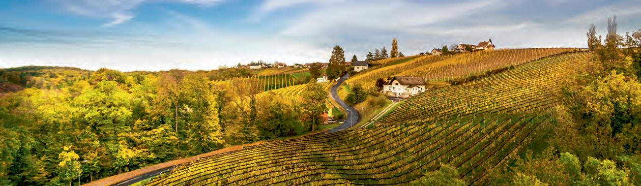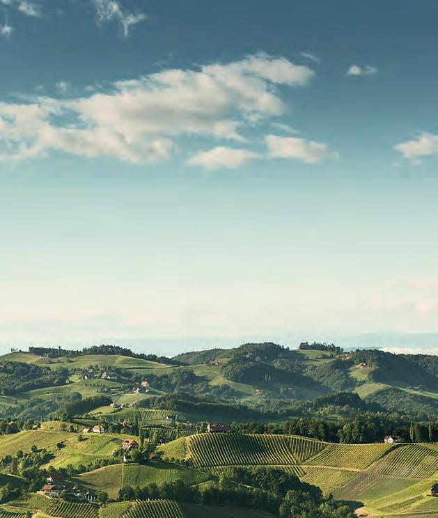 Orientierung hilft die Herkunftsbezeichnung DAC (Districtus Austriae Controllatus) für die gebietstypischen Qualitäts weine, die sich von Region zu Region stark unterscheiden. In Österreich teilt man weiter nach Gebietsweinen, Orts weinen und Riedenweinen ein. Gebietsweine sind junge, fri sche und primär fruchtige Weine. Ortsweine sind trockene Weine, die maximal vier Gramm Restzucker pro Liter haben (ausgenommen ist hier der Klöcher Traminer). Riedenweine sind die höchste Stufe mit individuellem Charakter. Am 23. November werden die großen Orts- und Riedenweine von den steirischen Winzer:innen in Wien präsentiert. Die aufregendste Zeit im Weinbau ist natürlich der Herbst, wenn die Ernte ansteht. Die diesjährigen Trauben lassen fruch tige Aromen bei ausgewogener Säure erwarten. Heuer wurde durch die etwas frühere Blüte, die durchgehende Hitzeperiode im Juni und Juli und den spät einsetzenden Gewitterregen bereits etwas früher (Anfang September) geerntet als üblich. Der Herbst ist auch die Zeit für Sturm und Junker. Sturm ist Traubenmost, dessen Gärung gerade erst angefangen hat. Erhältlich ist er in Rot, Weiß oder als Schilchersturm (aus der Blauen Wildbacher Traube). Von Tag zu Tag ändert er den Geschmack: Während er zu Beginn noch sehr süß ist, nimmt