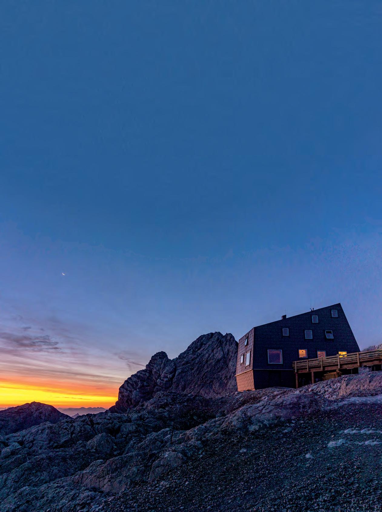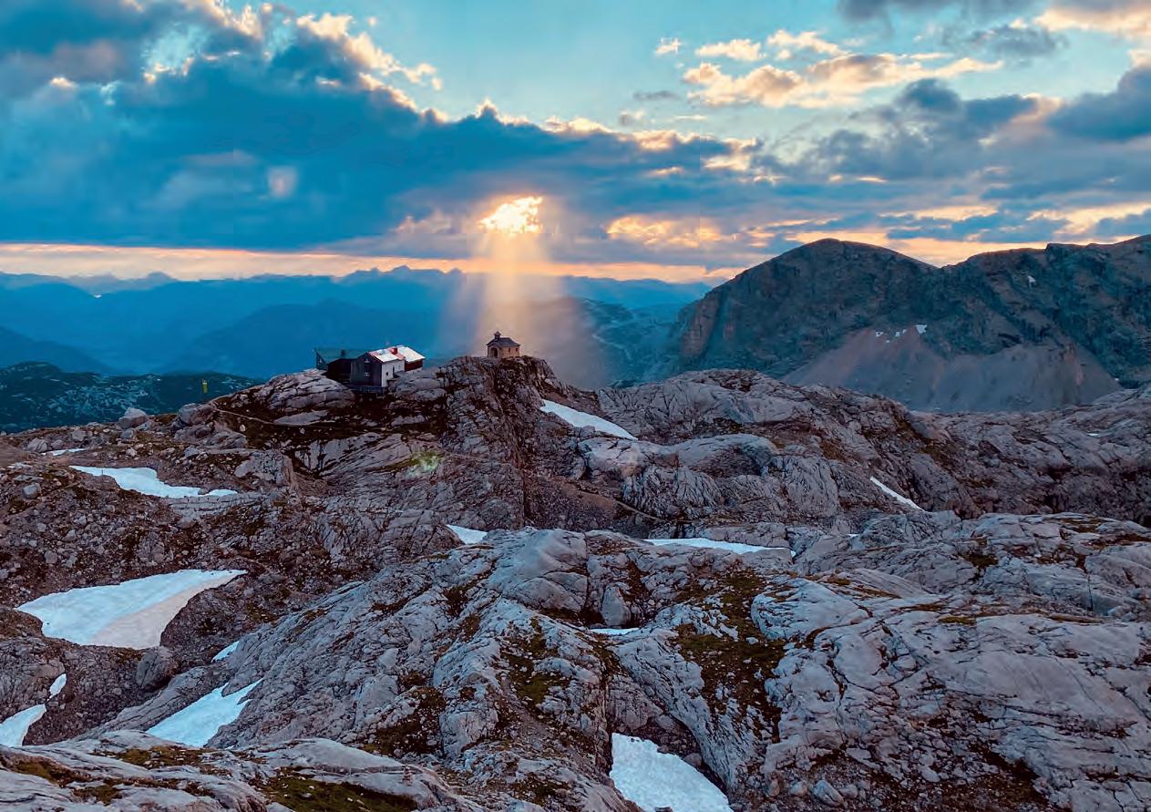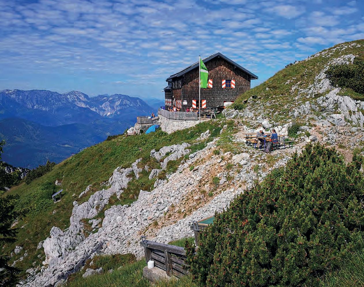 Fünf dieser Hütten im Salzkammergut inklusive Wanderrouten zeigen wir Ihnen ab Seite 86, und wir haben vom Alpenverein erfahren, was es für Hüttenwirte heißt, diese Kleinode zu bewirtschaften. Von Hüttenromantik ist die Arbeit auf den Bergen weit entfernt, denn auf abgelegenen Schutzhütten ist der Wirt meist Techniker, Brandschutzexperte, Koch und Erstversorger in einem. Wie man es schaffen kann, frisch, und nachhaltig zu kochen, wenn man nur alle drei bis vier Wochen mit einem Hubschauber versorgt wird, fanden wir bei unserer Einkehr bei Hüttenwirt Martin Scherr und seiner Frau Elisabeth auf der Adamekhütte am Dachsteingletscher heraus.