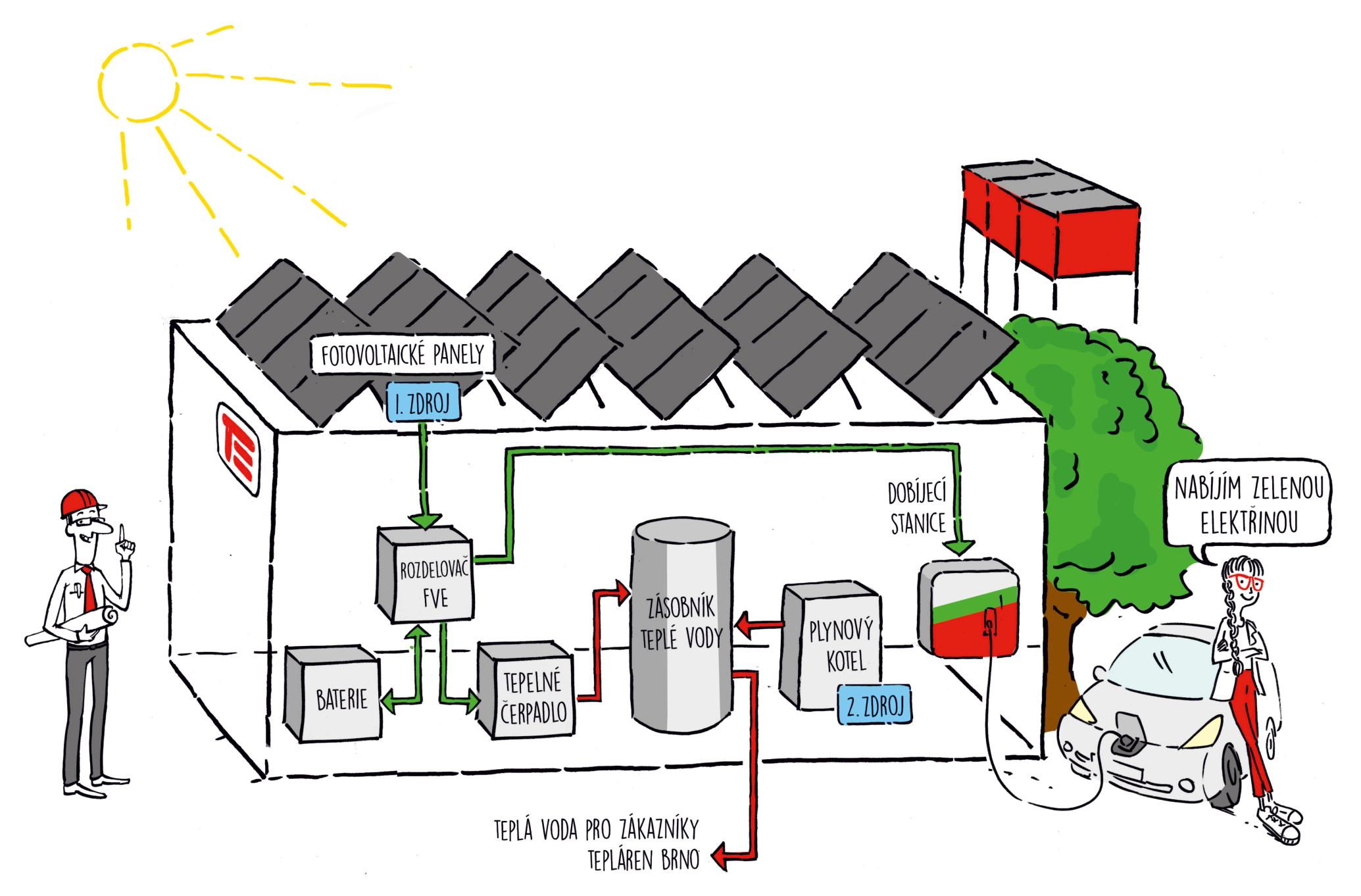 Starší kotelna na Jihomoravském náměstí v brněnské části Slatina tak nyní vyrábí teplo ze zemního plynu, ale i dvěma tepelnými čerpadly, která jsou poháněna „zelenou energií“ z fotovoltaické elektrárny instalované na střeše objektu. Vše je doplněné malou bateriovou aku-