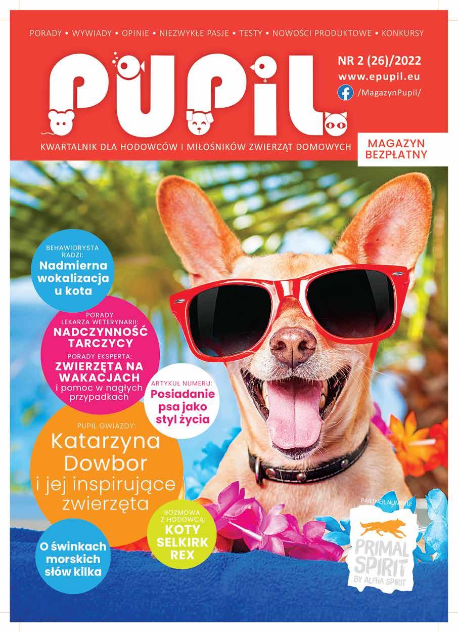 W stałych pupilowych rubrykach znajdziecie między innymi teksty: „Zwierzęta na waka- cjach i pomoc w nagłych przypadkach” – porady eksperta Angeliki Janosik z Przychodni Zdrowy Pupil w Lubinie. „Nie tresuj, a wychowuj” – autorstwa Kariny Suchorowskiej z Piesełkowa. Patrycja Hendzel-Stefan opowiedziała nam, czym jest dogoterapia. Poznacie koty Selkirk Rex z hodowli Felis Finezja. Mieliśmy przyjemność rozmawiać z Katarzyną Dowbor, która specjalnie dla was opowiedziała o swoich pupilach.