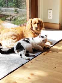 Najmłodsza jest suczka Bonnie, która teoretycznie jest golden retrieverem, ale tak naprawdę została uratowana z pseudoho dowli i nie jestem pewna, czy oboje jej rodzice byli psami rasowymi. Wygląda jak golden retriever, troszkę jakby spaniel i jest wyraźnie mniejsza od retrievera. Myślę, że któryś z jej przodków miał nie do końca szlachetne geny. Oczywiście absolutnie nam to nie przeszkadza. Nigdy nie zamierzaliśmy pokazywać jej na żadnych wystawach. Natomiast jest istotą absolutnie cudowną, kochającą, empatyczną, dobrą, bardzo mądrą. Teraz tutaj obok mnie, siedzi, śpi sobie właściwie. Przeniosłam jej łóżeczko do mojego gabinetu i sobie tak