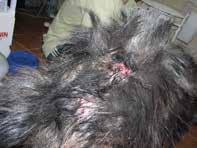 Pies z alergicznym pchlim zapalaniem skóry. Zmiany w okolicy lędźwiowo-krzyżowej w postaci ropnego powierzchniowego zapalania skóry wtórego do choroby podstawowej. Widoczne wyłysienia, przerzedzenie włosa i rumień oraz inne wykwinty związane z uszkodzeniem skóry na skutek drapania.