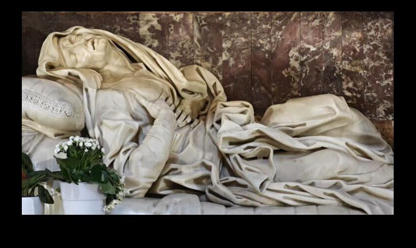 The first piece of art inspiration came in a postcard of an 18th-century sculpture by Giovanni Battista Maini my husband discovered while visiting the Basilica of Sant’Andrea delle Fratte in Rome. It depicted St. Anne alone on her bed, in the throes of a painful death. She clasps her right breast, exposed through her robe, her face distorted, her body seized by suffering. Its power carried a message, but it wasn’t clear at first. A few weeks later the image moved me one morning in prayer to “Enter into the suffering that women have undergone, act from that, and go to Rome.”