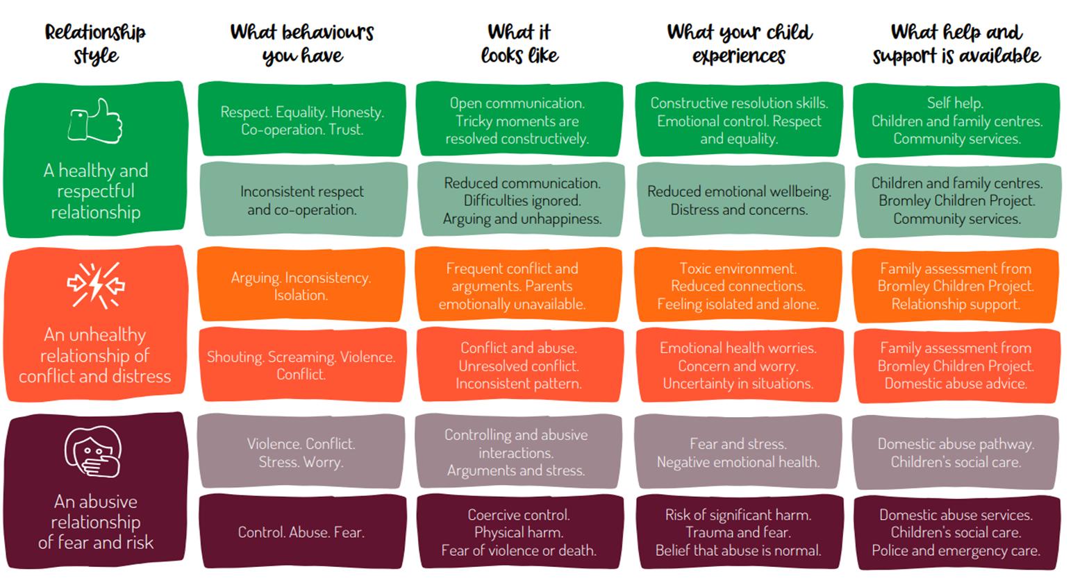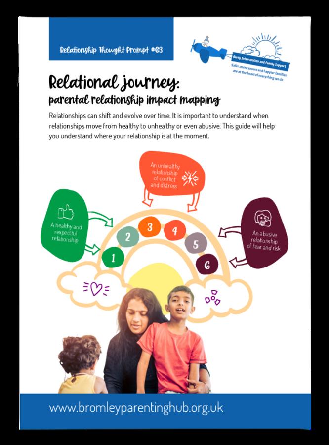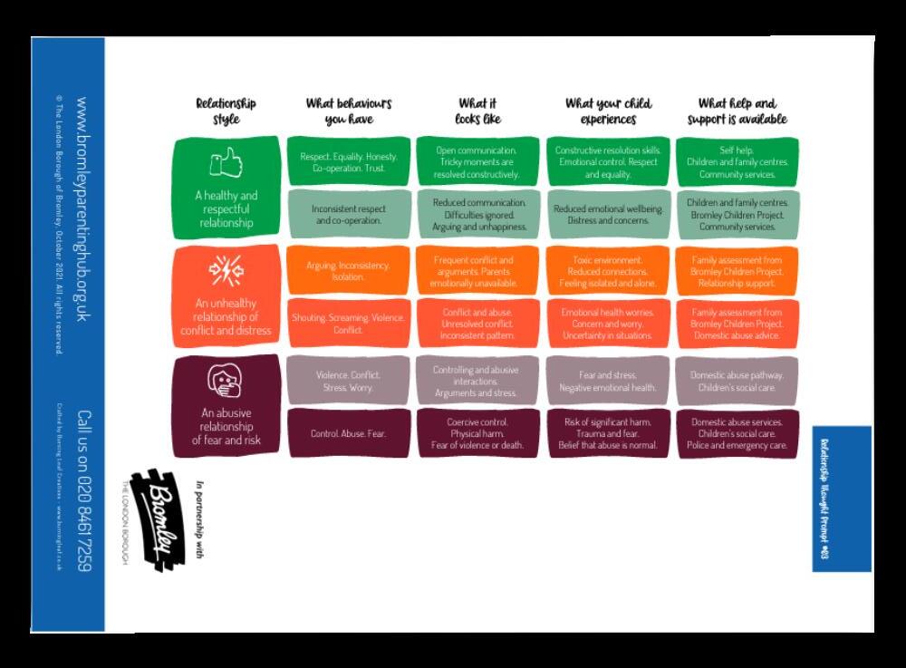 Relationshipcanshiftandevolveovertime.Itisimportanttounderstand whenrelationshipmovesfromhealthyrelationshiptounhealthyoreven abuse.Wecanuseoneof10RelationshipThought Promptcard(cardnumber 3)to mapparentalrelationshipacross parent's behaviour,child’s experienceand supportavailable inBromley.