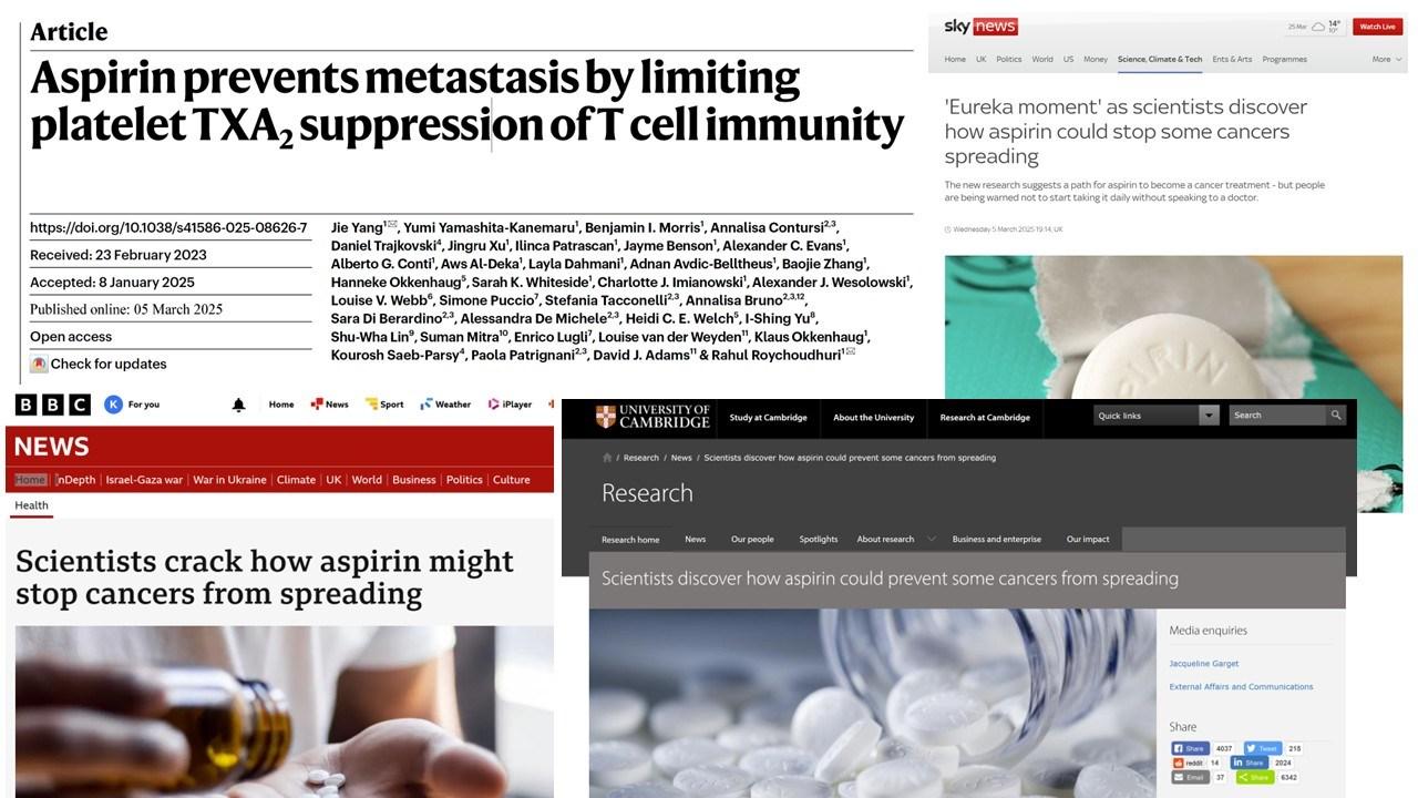 Should aspirin turn out to be effective at reducing the chance of relapse inanyofthesecancers,thenwewouldhaveacancertherapeuticathand which every health care system in the world can afford to provide. Aspirin costs only pennies per pill (so no-one will get rich from this discovery!). Both the CRUK and MRC are funding our efforts to help better understand the potential of aspirin and related drugs to prevent cancermetastasis.