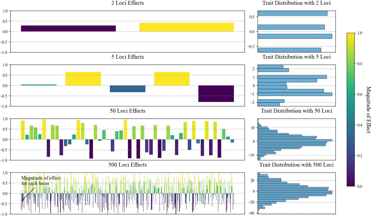Illustration of Ronald Fisher’s (1918) ‘infinitesimal model’, explaining the emergence of continuous biological variation from the combined contribution of a large number of discrete Mendelian genes, or loci. Each row in the diagram presents a simulated distribution of population values for a trait determined by an increasing number of individual genes. The bars on the left-hand side indicate the individual effect of each gene contributingtothetrait (rangingfrom onlytwo genesin thetopcaseto500in thebottom case). The right-hand side provides the corresponding distributions of trait values in the simulated population, showing how the values for a trait become more normally distributed as the number of genes increases. This explains why many physiological characters in humans and other species follow a normal (or Gaussian) distribution. (Credit: Chamaemelum/Wikimedia Commons)