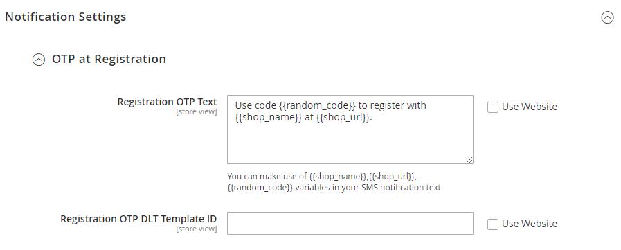 ● Registration OTP Text: Set custom text using variables for sending OTP SMS for Registration.