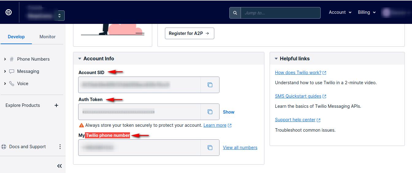 Step 2:- In your Twilio Dashboard, add Account SID, Auth Token and Twilio phone number in the Account Info section.