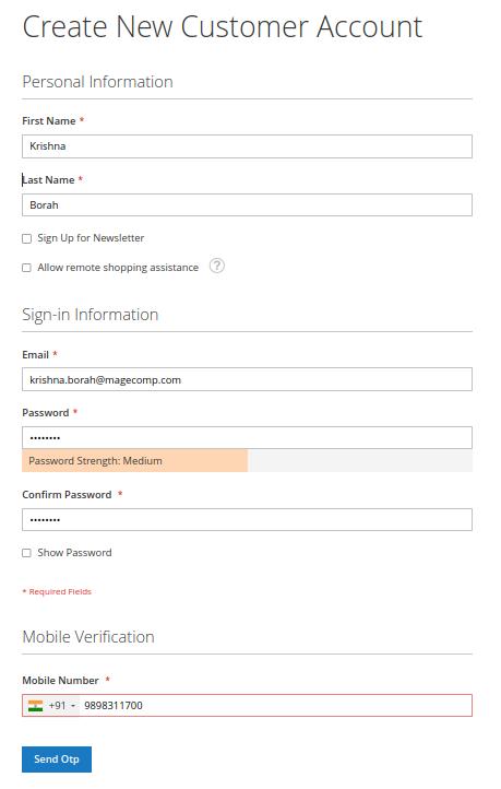 Once the OTP is verified successfully, the user is redirected to enter the account details. Here users can add details like first name, last name, email ID and password. The Customer registration through OTP is protected by reCAPTCHA to avoid spam registrations.