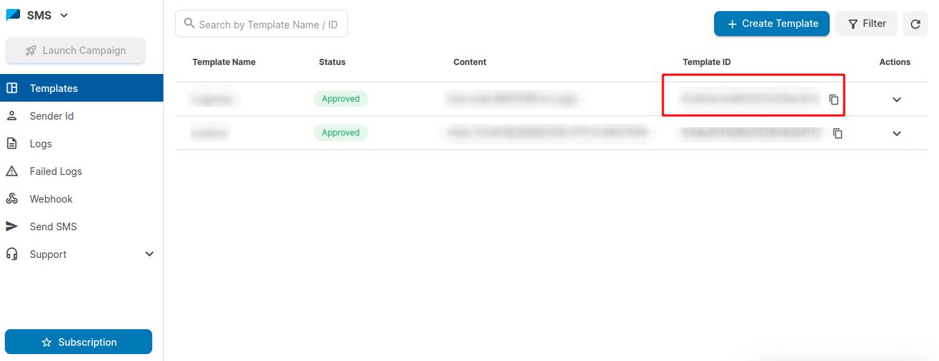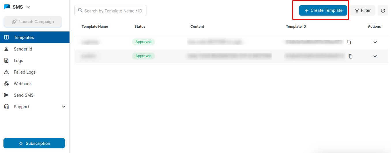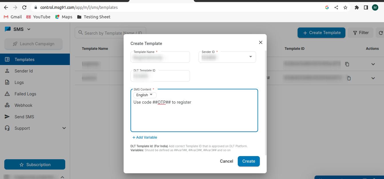 Step 3:- Add Template Name, Sender ID, DLT Template ID (only for Indian customers) and SMS Content And then click the Create button.
