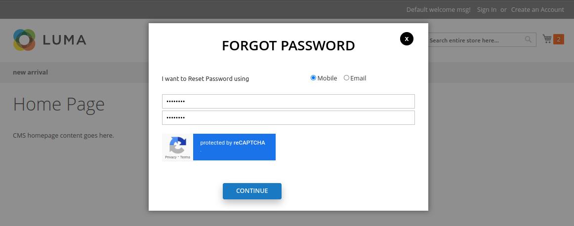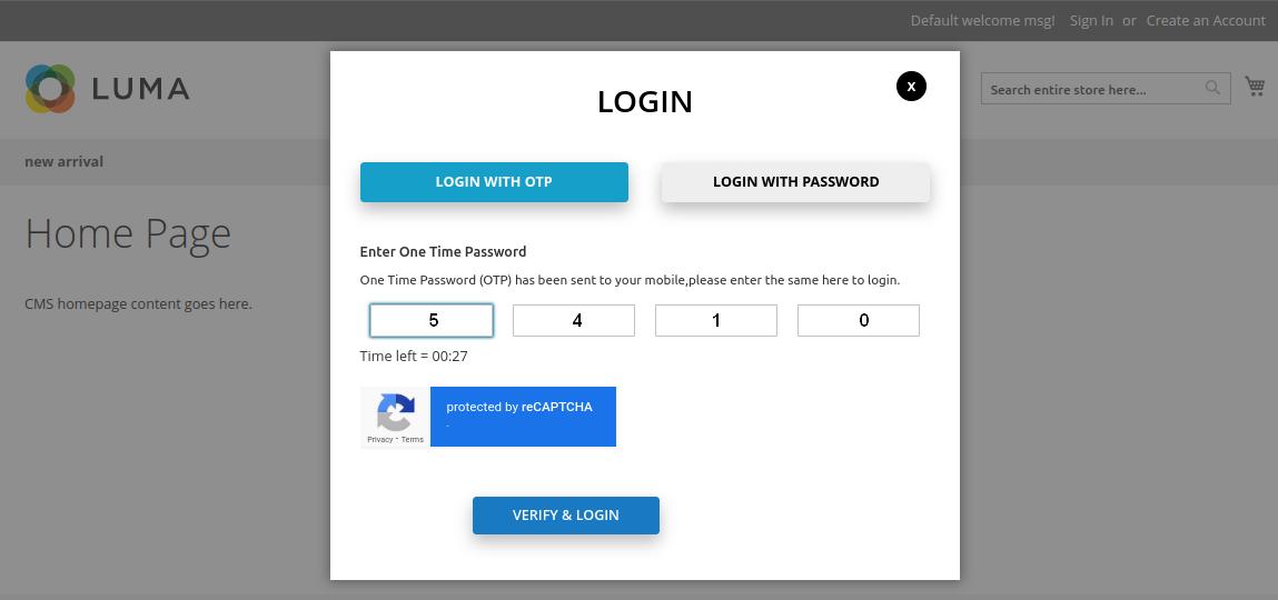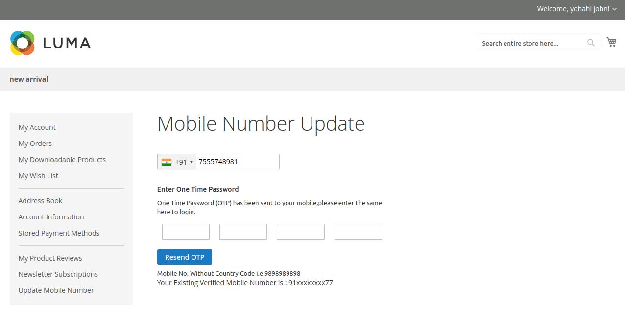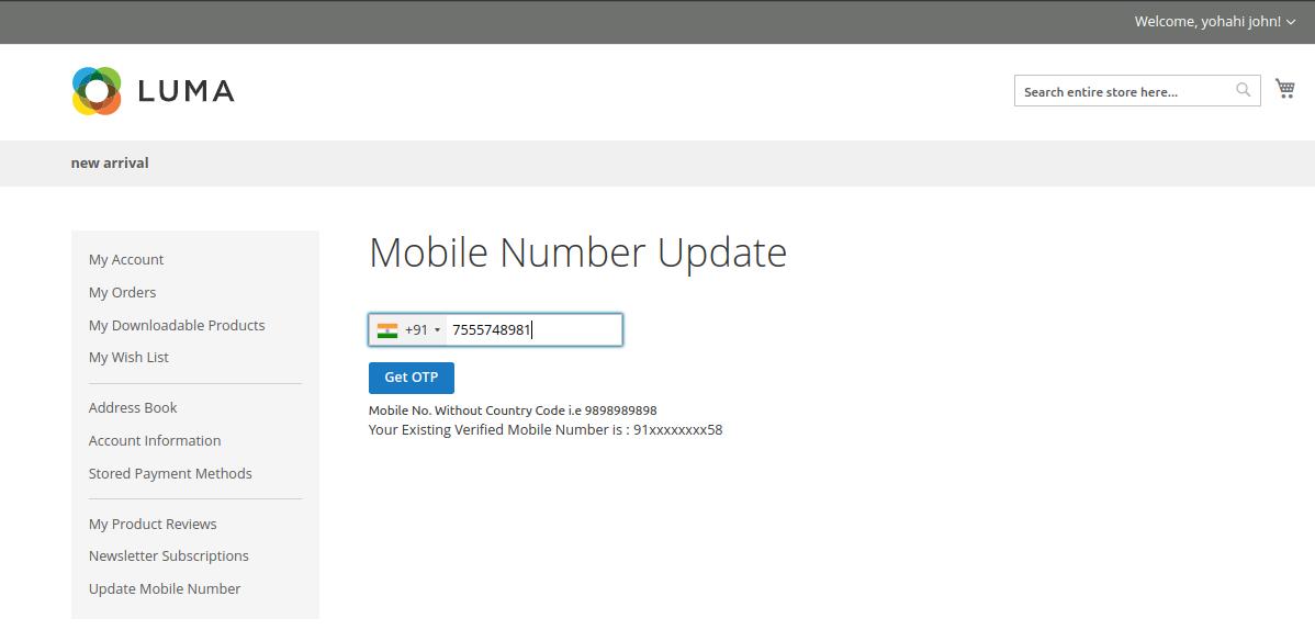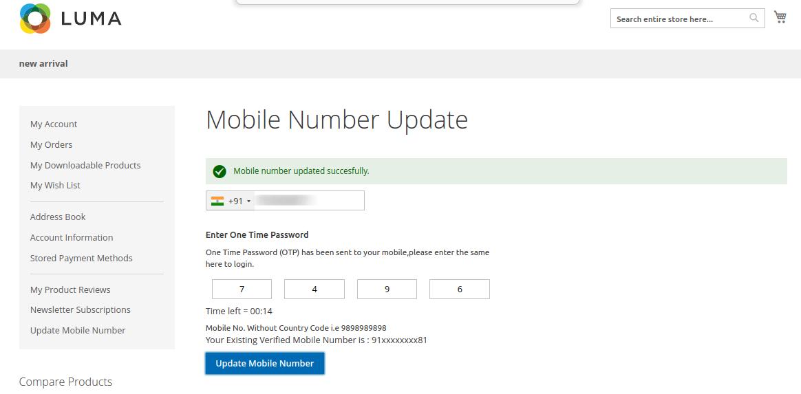 Once the OTP is verified, the login is successfully done. The old customer is redirected to the Update Mobile Number section on their My Account page. The Customer Login through OTP is protected by reCAPTCHA to avoid spam sign-in.