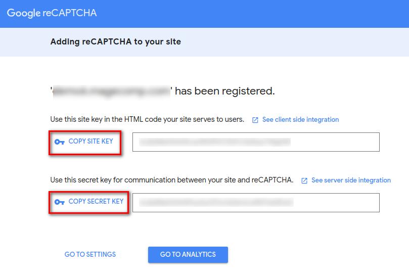 Step 5:- Once the registration is successful, the site key and secret key are generated randomly. You can Copy the Site Key and Secret Key from here.