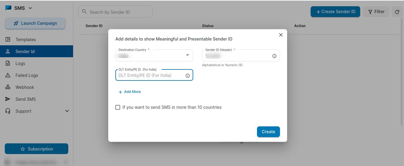 Step 5:- Select Destination Country , enter Sender ID and DLT ID and click on Create button.