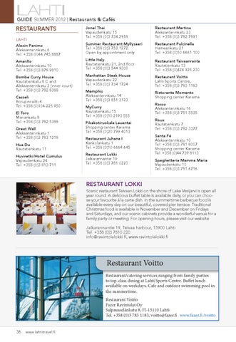Restaurant Voitto Restaurant/catering services ranging from family parties to top-class dining at Lahti Sports Centre. Buffet lunch available on weekdays. Cafe and outdoor swimming pool in the summertime. Restaurant Voitto Fazer Ravintolat Oy Salpausselänkatu 8, FI-15110 Lahti Tel. +358 (0)3 783 1183, voitto@fazer.fi www.fazer.fi /voitto 36 www.lahtitravel.fi