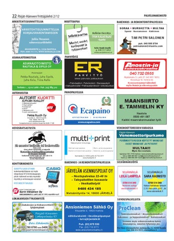 22 Päijät-Hämeen Yrittäjälehti 2/12 ARKKITEHTISUUNNITTELUA ARKKITEHTISUUNNITTELUA KORJAUSRAKENTAMISEEN Jukka Vesanen rakennusarkkitehti MUURARINTIE 4, 15550 NASTOLA PUH. 0440 711 711, WWW.TAIVASALLA.COM