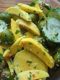 Slice cucumbers and mangoes
