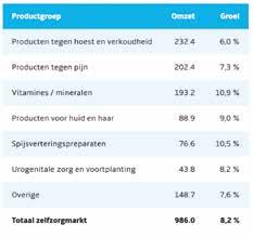 Overall steeg de omzet van de totale zelfzorgmarkt in 2023 met 8,2% naar 986 miljoen euro. Ook het aantal verkochte verpakkingen steeg met 2,2 % naar 177,4 miljoen.
