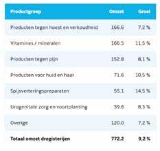 productgroepen Spijsverteringspreparaten (+ 14,5%), Vitamines/ Mineralen (+ 11,5% en Producten voor Huid en Haar (+ 10,5%). Dat zijn overigens precies de segmenten waarin de supermarkten een veer moesten laten.