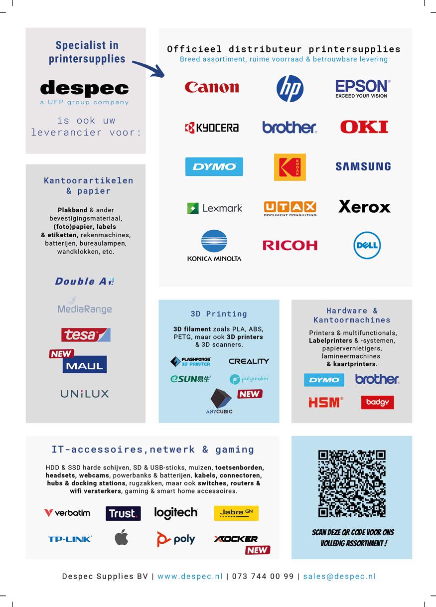 Distributeur Despec is niet langer alleen uw leverancier van inkt & tonercartridges. Wij zijn nog steeds officieel distributeur in printer supplies van alle grote merken zoals HP, Canon & Brother. De afgelopen tijd zijn nieuwe productgroepen & merken toegevoegd aan ons assortiment. Steeds meer kantoorartikelen, accessoires voor het thuiskantoor & IT-accessoires kunt u bij Despec inkopen. U kunt ook kleinere IT-accessoires inkopen voor het inrichten van een (thuis)kantoor. Naast Logitech, kunt u nu ook de muizen & toetsenborden van Cherry bij ons verkrijgen. Ook van Kensington hebben we accessoires in ons assortiment opgenomen, zoals docking stations, muizen, headsets, maar tevens privacy filters en overige ergonomisch accessoires. Neem zeker een kijkje op onze webshop! www.despec.be