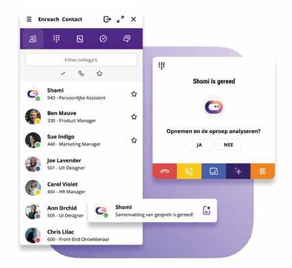 Op persoonlijk niveau is er Shomi. Deze AI-assistent is standaard beschikbaar voor alle gebruikers van Enreach Contact. Shomi luistert mee tijdens gesprekken, vat samen, maakt actiepunten aan en werkt volledig mee in je bestaande werkwijze, zonder dat je iets hoeft in te stellen. Daarnaast is het mogelijk om de genoemde gespreksverslagen auto-