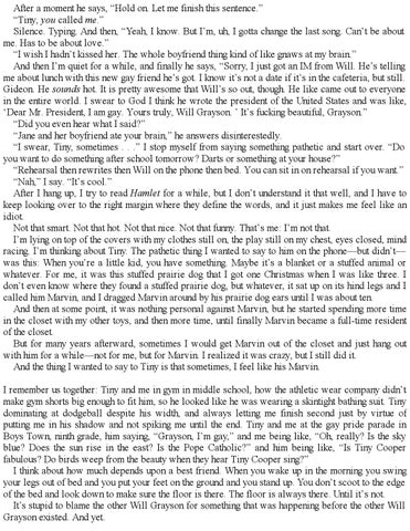 After a moment he says, “Hold on. Let me finish this sentence.” “Tiny, you called me.” Silence. Typing. And then, “Yeah, I know. But I’m, uh, I gotta change the last song. Can’t be about me. Has to be about love.” “I wish I hadn’t kissed her. The whole boyfriend thing kind of like gnaws at my brain.” And then I’m quiet for a while, and finally he says, “Sorry, I just got an IM from Will. He’s telling me about lunch with this new gay friend he’s got. I know it’s not a date if it’s in the cafeteria, but still. Gideon. He sounds hot. It is pretty awesome that Will’s so out, though. He like came out to everyone in the entire world. I swear to God I think he wrote the president of the United States and was like, ‘Dear Mr. President, I am gay. Yours truly, Will Grayson. ’ It’s fucking beautiful, Grayson.” “Did you even hear what I said?” “Jane and her boyfriend ate your brain,” he answers disinterestedly. “I swear, Tiny, sometimes . . .” I stop myself from saying something pathetic and start over. “Do you want to do something after school tomorrow? Darts or something at your house?” “Rehearsal then rewrites then Will on the phone then bed. You can sit in on rehearsal if you want.” “Nah,” I say. “It’s cool.” After I hang up, I try to read Hamlet for a while, but I don’t understand it that well, and I have to keep looking over to the right margin where they define the words, and it just makes me feel like an idiot. Not that smart. Not that hot. Not that nice. Not that funny. That’s me: I’m not that. I’m lying on top of the covers with my clothes still on, the play still on my chest, eyes closed, mind racing. I’m thinking about Tiny. The pathetic thing I wanted to say to him on the phone—but didn’t— was this: When you’re a little kid, you have something. Maybe it’s a blanket or a stuffed animal or whatever. For me, it was this stuffed prairie dog that I got one Christmas when I was like three. I don’t even know where they found a stuffed prairie dog, but whatever, it sat up on its hind legs and I called him Marvin, and I dragged Marvin around by his prairie dog ears until I was about ten. And then at some point, it was nothing personal against Marvin, but he started spending more time in the closet with my other toys, and then more time, until finally Marvin became a full-time resident of the closet. But for many years afterward, sometimes I would get Marvin out of the closet and just hang out with him for a while—not for me, but for Marvin. I realized it was crazy, but I still did it. And the thing I wanted to say to Tiny is that sometimes, I feel like his Marvin. I remember us together: Tiny and me in gym in middle school, how the athletic wear company didn’t make gym shorts big enough to fit him, so he looked like he was wearing a skintight bathing suit. Tiny dominating at dodgeball despite his width, and always letting me finish second just by virtue of putting me in his shadow and not spiking me until the end. Tiny and me at the gay pride parade in Boys Town, ninth grade, him saying, “Grayson, I’m gay,” and me being like, “Oh, really? Is the sky blue? Does the sun rise in the east? Is the Pope Catholic?” and him being like, “Is Tiny Cooper fabulous? Do birds weep from the beauty when they hear Tiny Cooper sing?” I think about how much depends upon a best friend. When you wake up in the morning you swing your legs out of bed and you put your feet on the ground and you stand up. You don’t scoot to the edge of the bed and look down to make sure the floor is there. The floor is always there. Until it’s not. It’s stupid to blame the other Will Grayson for something that was happening before the other Will Grayson existed. And yet.