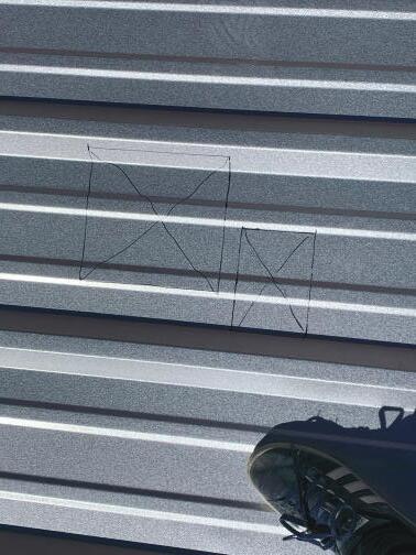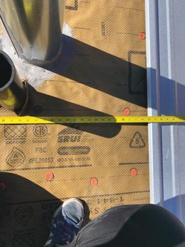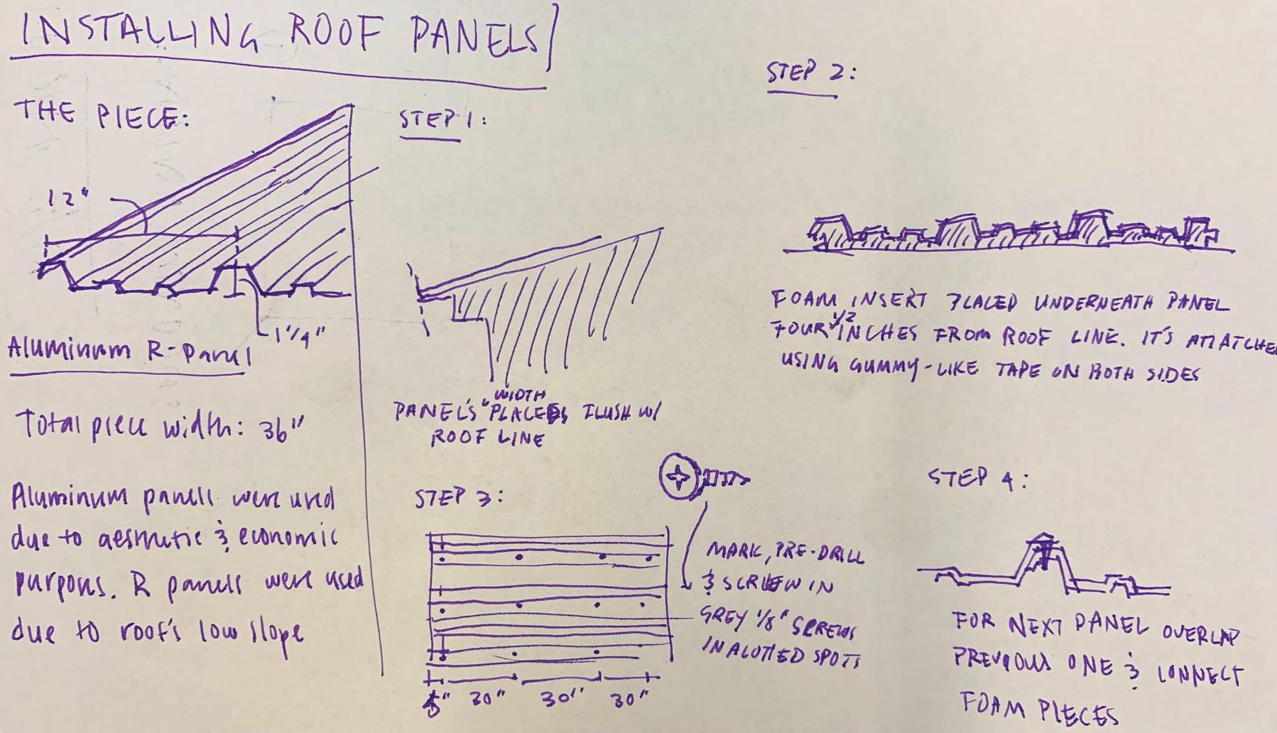 Installing roof panels has been the most involved process that I have been involved in so far related to on-site work. The picture above shows an page from my journal explaining the process. Photos below show the process of marking out holes to fit extruding pipes. Since boots protecting the pipes are circular, one large hole allow for large gaps in the panel making it much easier for the roof to rot. My task was to mark where the holes needed to be with utmost precision. Measuring from the edges of the panel, and using my tape measure as a guide, the holes ended up exactly where they needed to be.