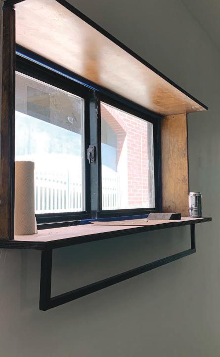 Each piece of built furniture was made with birch plywood with a cherry wood trim added around the edges of the vanity. The towel holders on the cabinet and the window sill and the vanity’s feet were personally welded from hot-rolled steel pipes and spray painted. All wooden surfaces were coated in several layers of polyurthane to protect it from water damage.