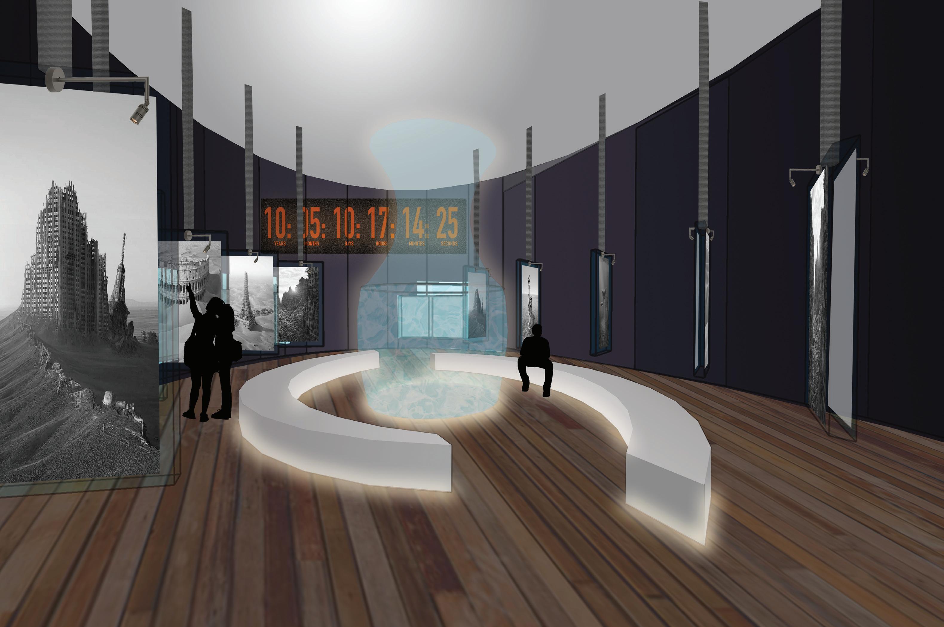 Viewers can move through impactful artist renditions of the future effects of climate change while always having the passage of time ever-present in their minds. Low levels of disclosure allow the compact space to feel more freeing, while never allowing viewers to fully escape the sight of the central display.