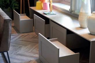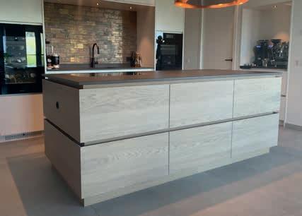 Een huis laten bouwen een zenuwslopend proces? Niet in hun beleving. Inge: ‘Het was een feestje. Vanaf het begin werden we ontzorgd. We konden achterover leu nen tot we iets moesten beslissen. Heel relaxed.’ Ze had den zelf een goed idee van wat ze wilden, maar hadden ook veel aan de suggesties van de vakmensen. Inge: ‘Toen Jacco voorstelde om de kastjes in de achterwand van de keuken om de apparatuur heen te bouwen, dacht ik eerst: moet dat? Maar het is prachtig geworden – je ziet meteen dat het maatwerk is en dat geeft een luxueuze uitstraling. In dat soort ideeën is hij heel goed.’ René: ‘De verdeling van de stalen deuren was een puzzel; dat werd eerst te krap. Maar Pieter heeft dat uiteindelijk prachtig opgelost. Met zijn aandacht voor detail voorkwam hij bijvoorbeeld >