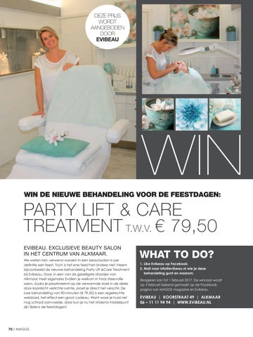 WHAT TO DO? 1. L ike Evibeau op Facebook. 2. Mail naar info@evibeau.nl wie je deze behandeling gunt en waarom. Reageren kan tot 1 februari 2017. De winnaar wordt op 3 februari bekend gemaakt op de Facebookpagina van MAGGS magazine en Evibeau.
