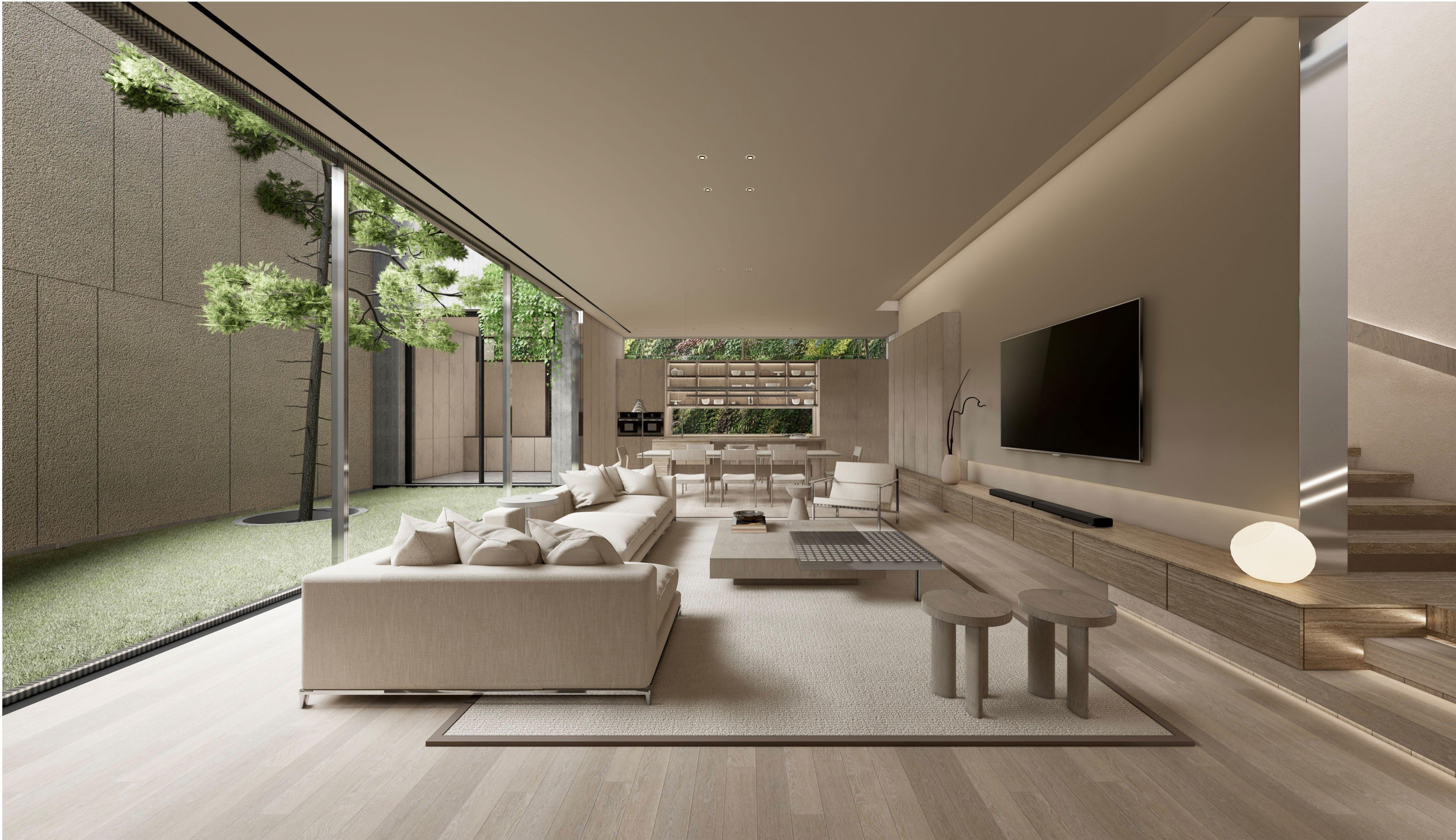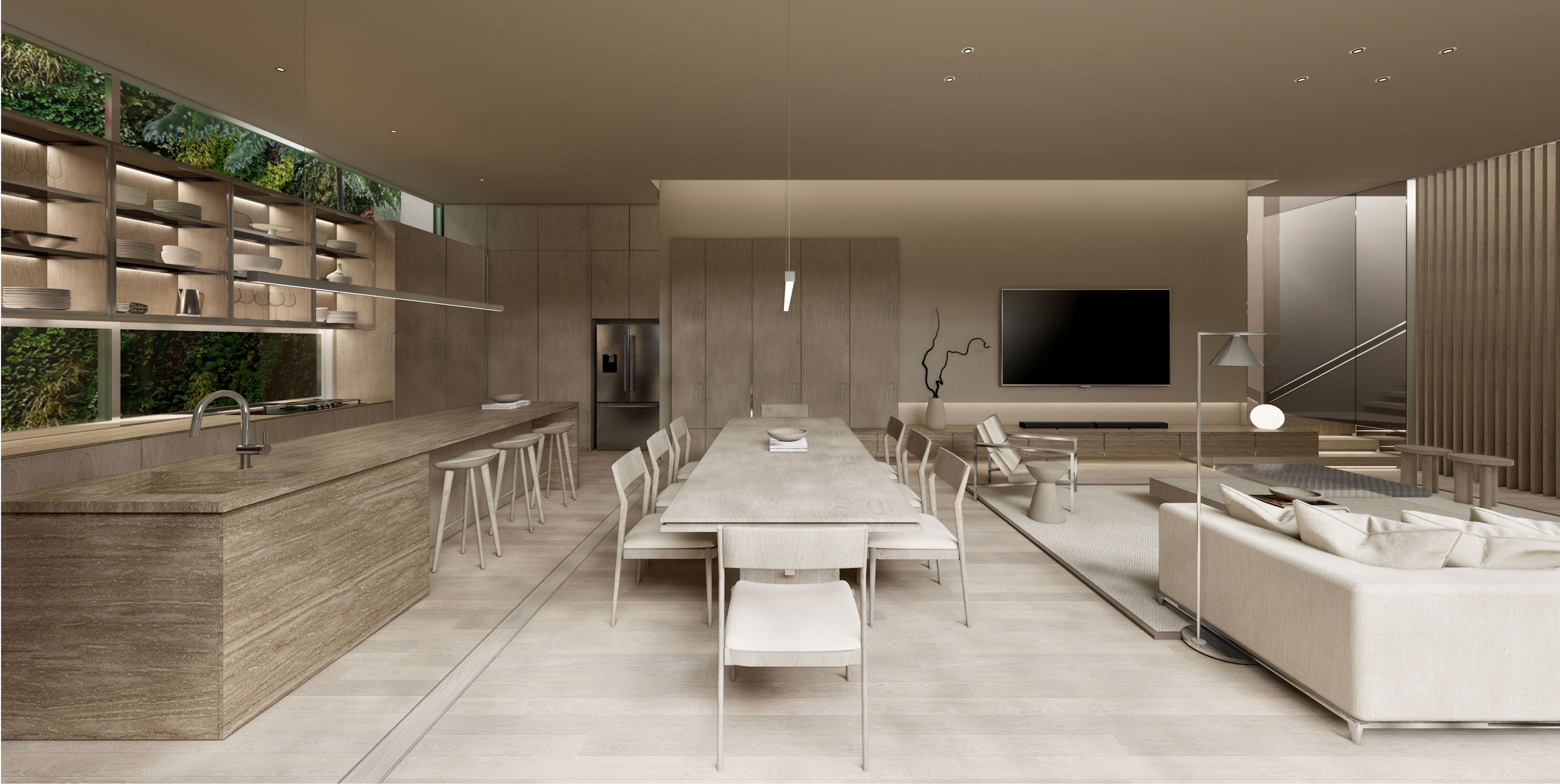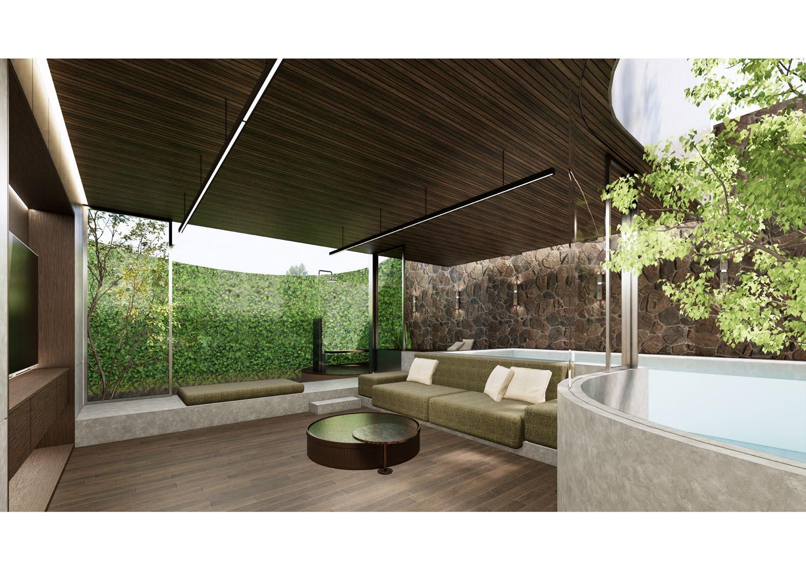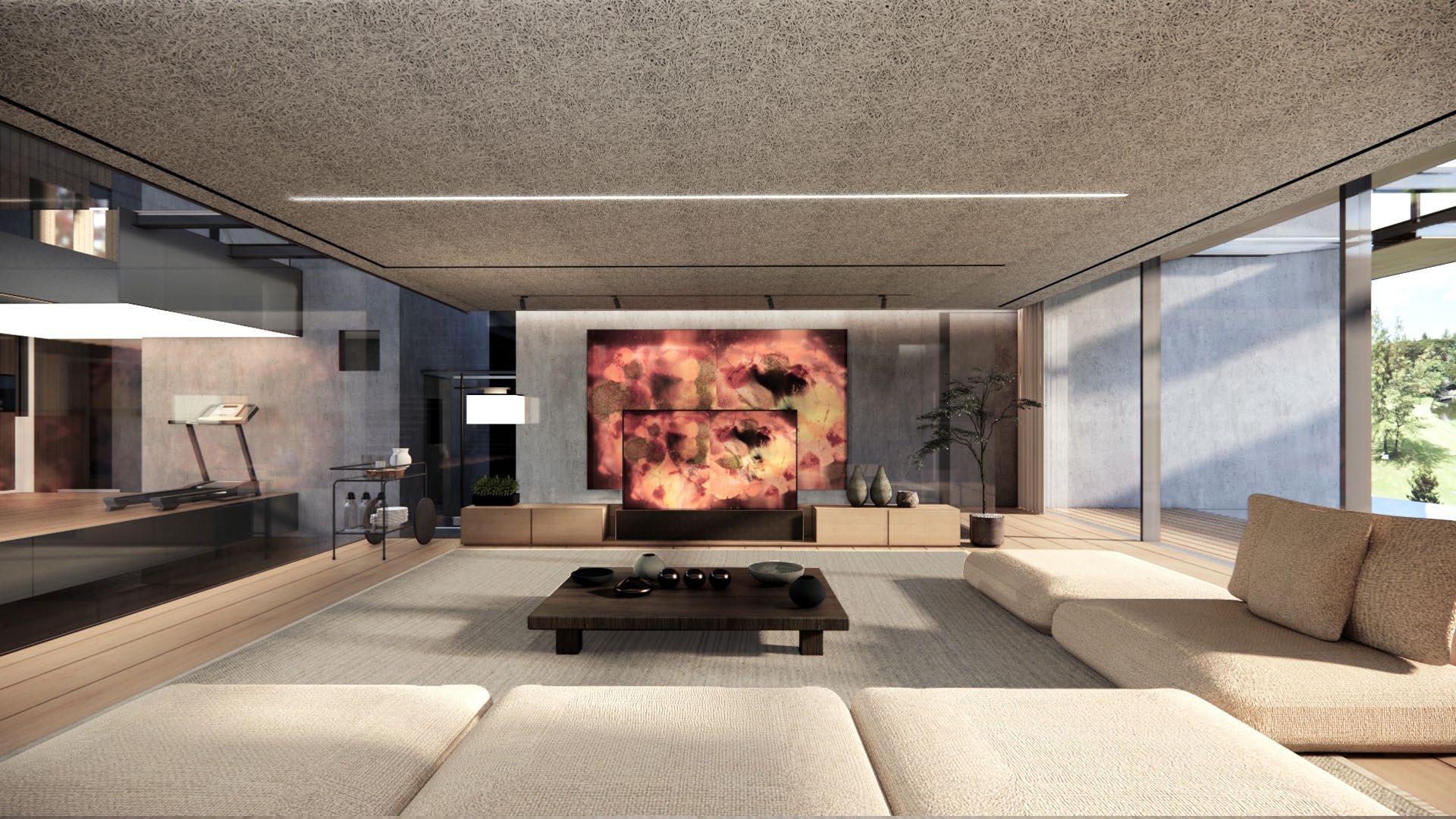 The enjoyment space of the living room is deliberately close to the swimming pool, providing a sensation of water and fun.