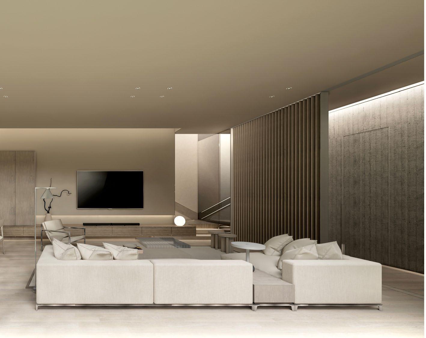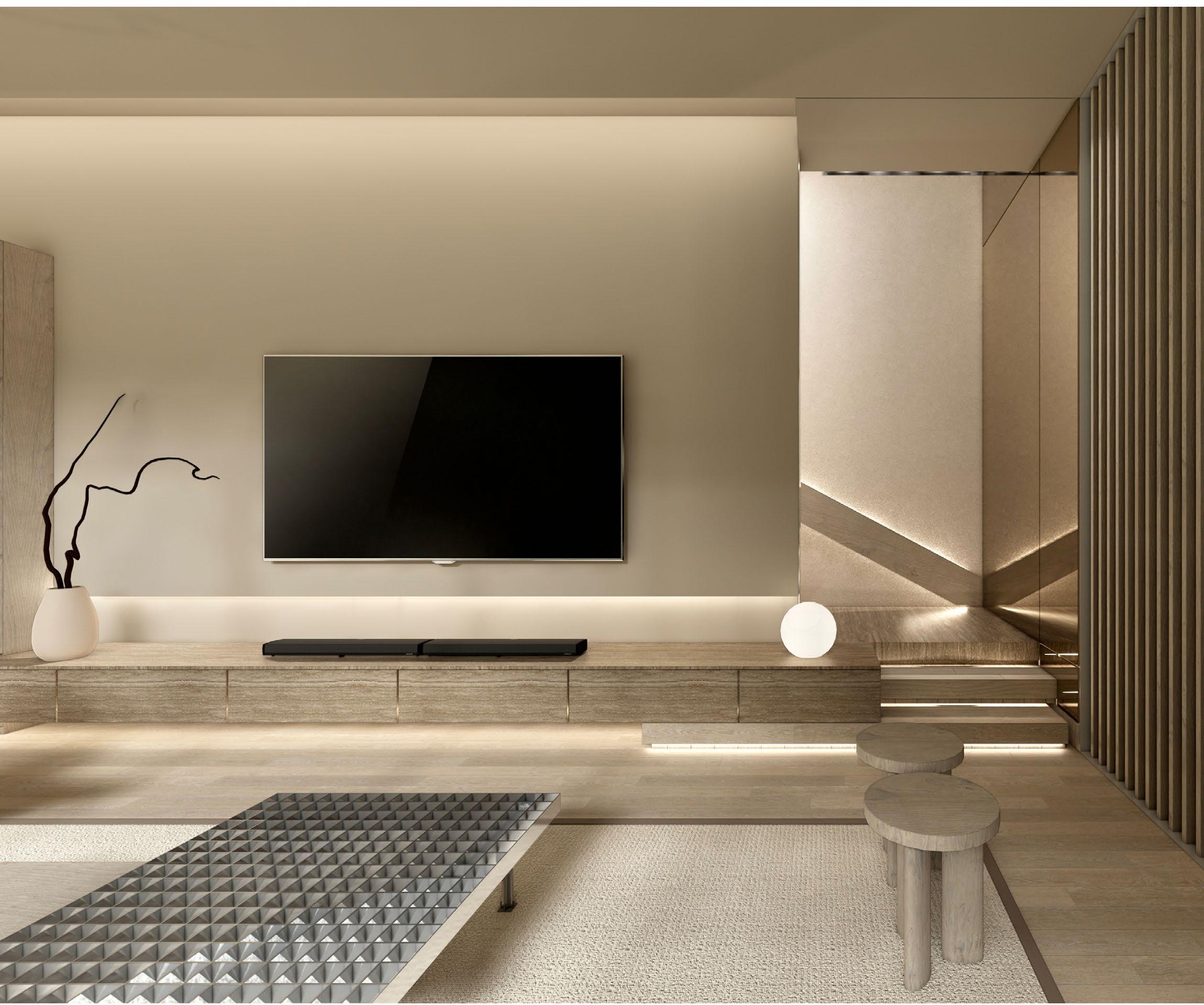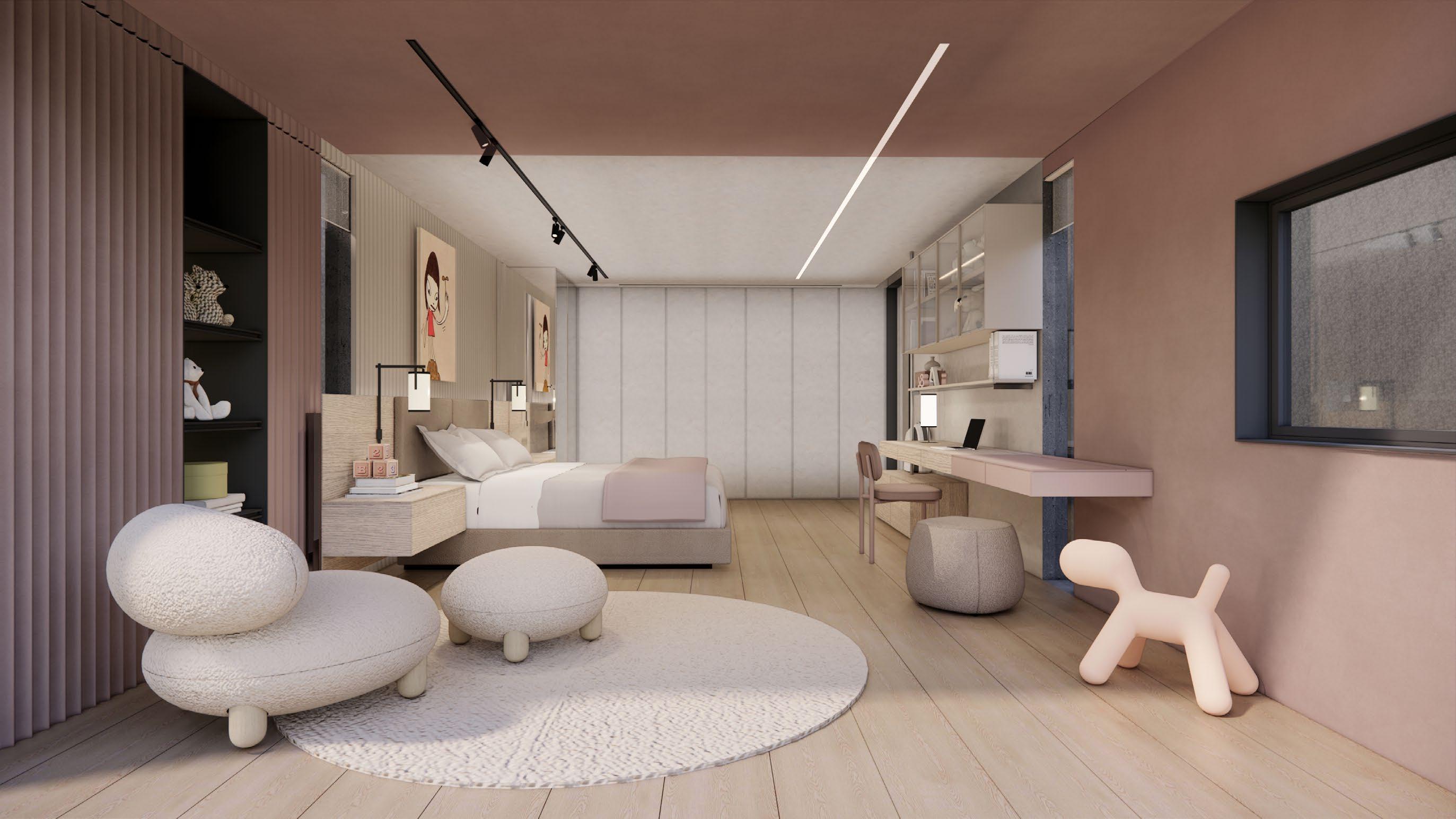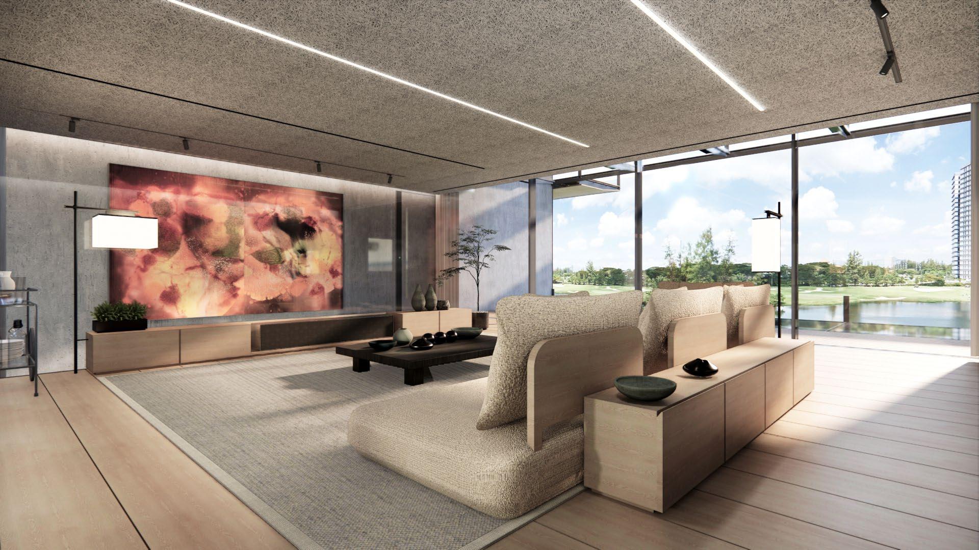The enjoyment space of the living room is deliberately close to the swimming pool, providing a sensation of water and fun.