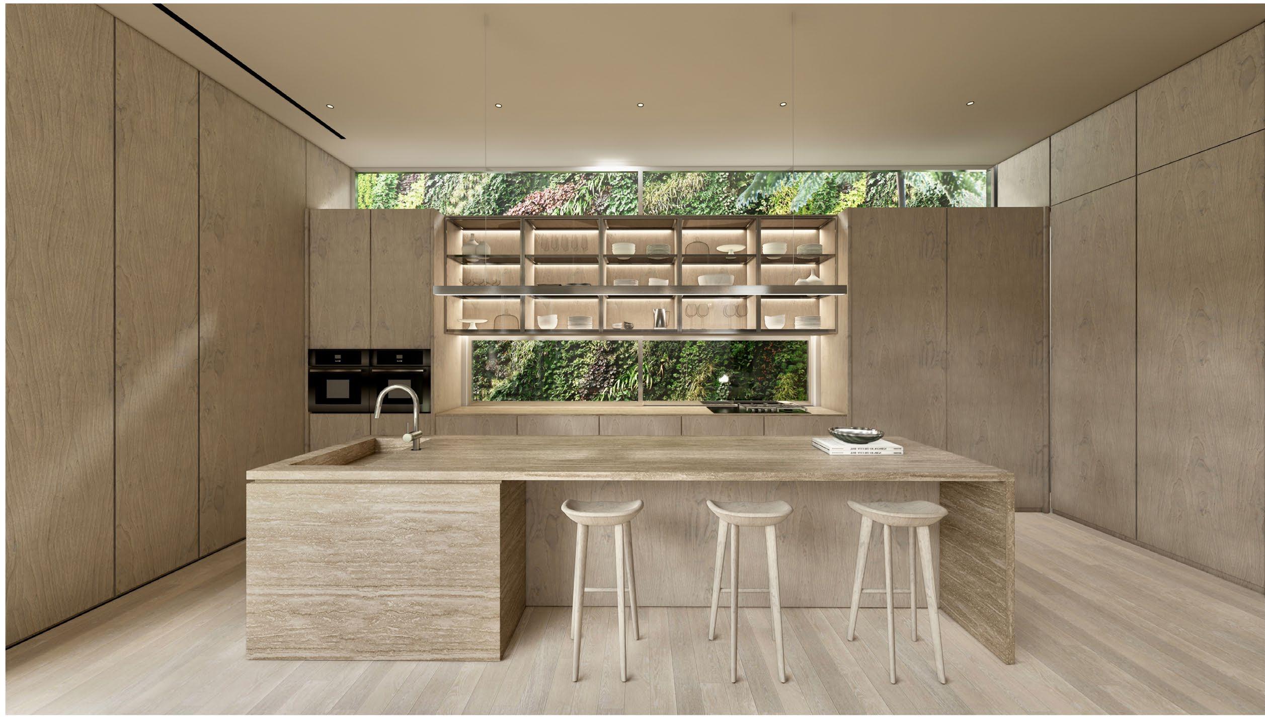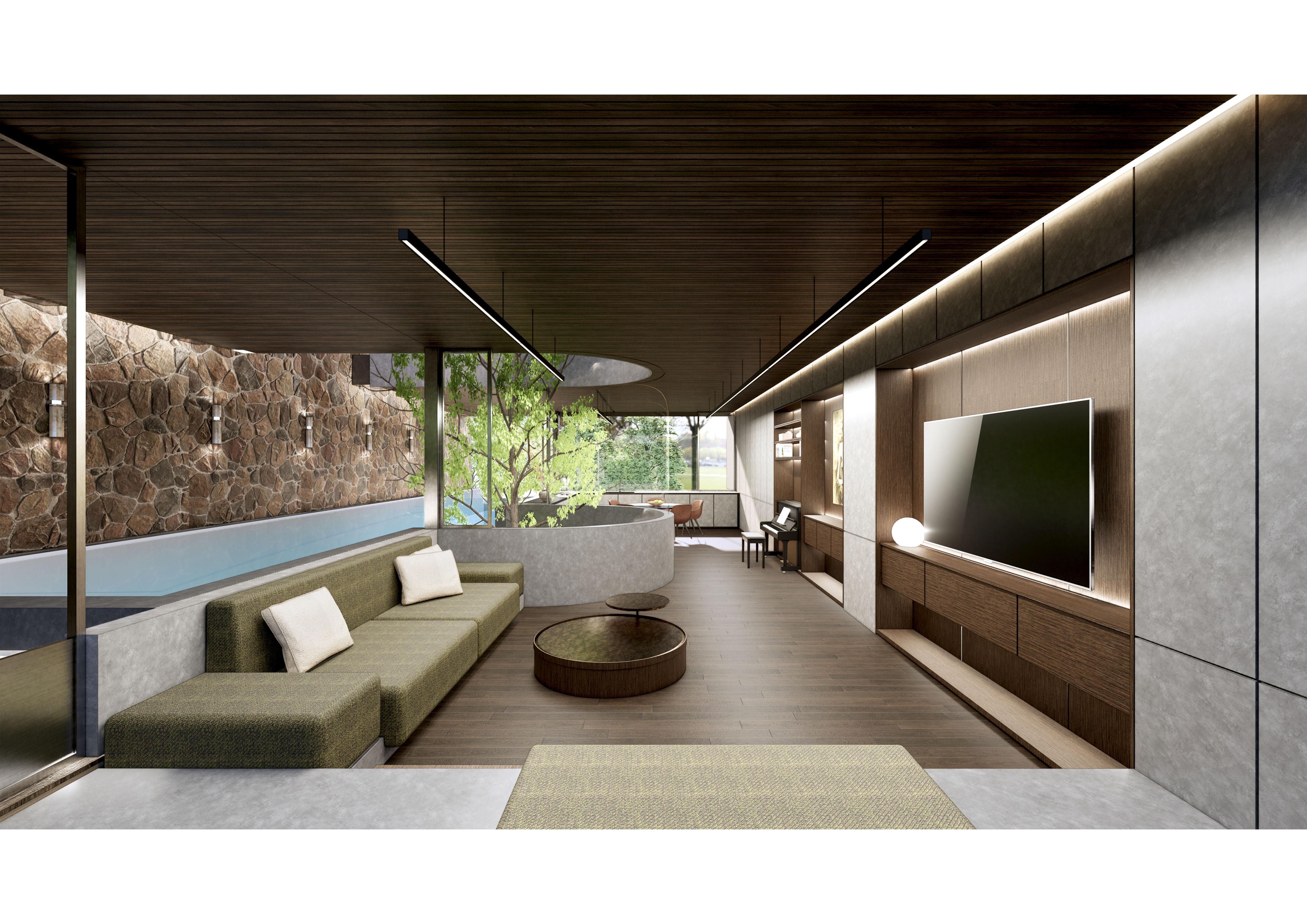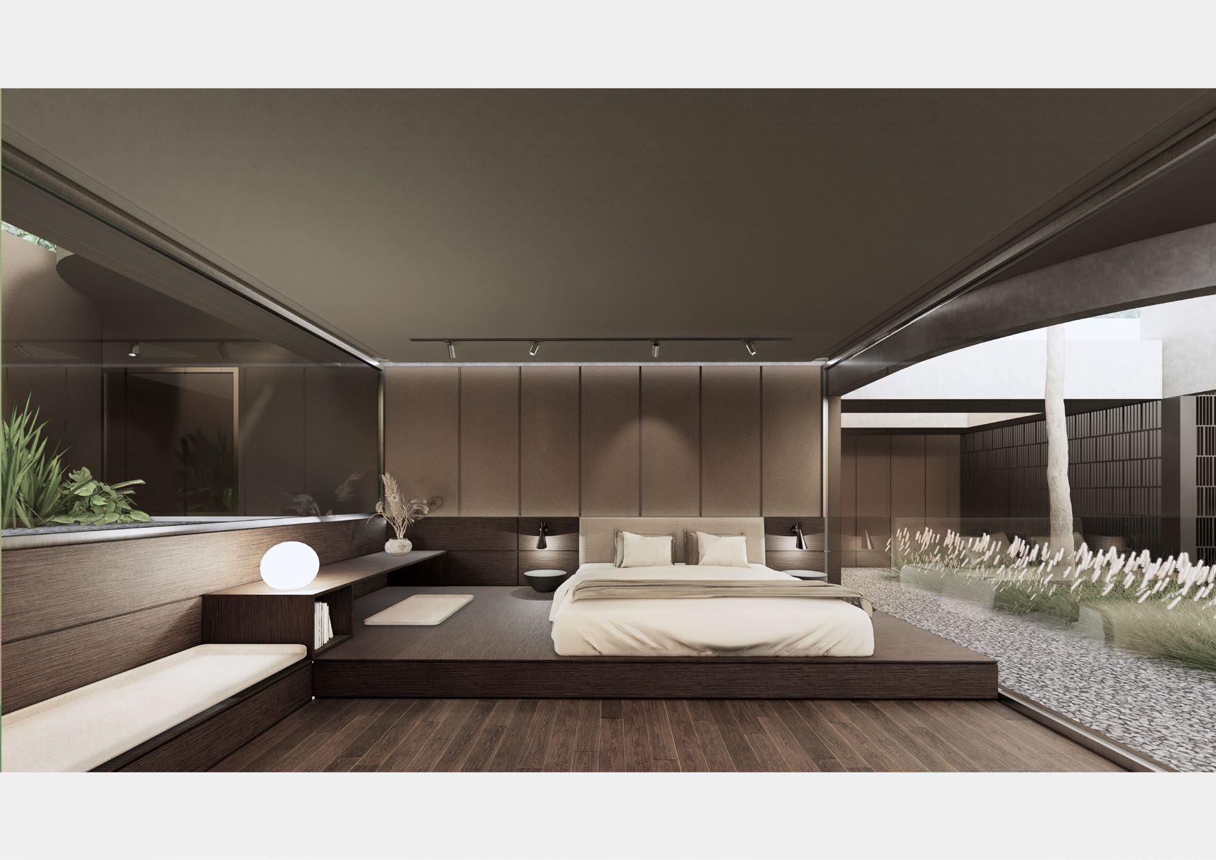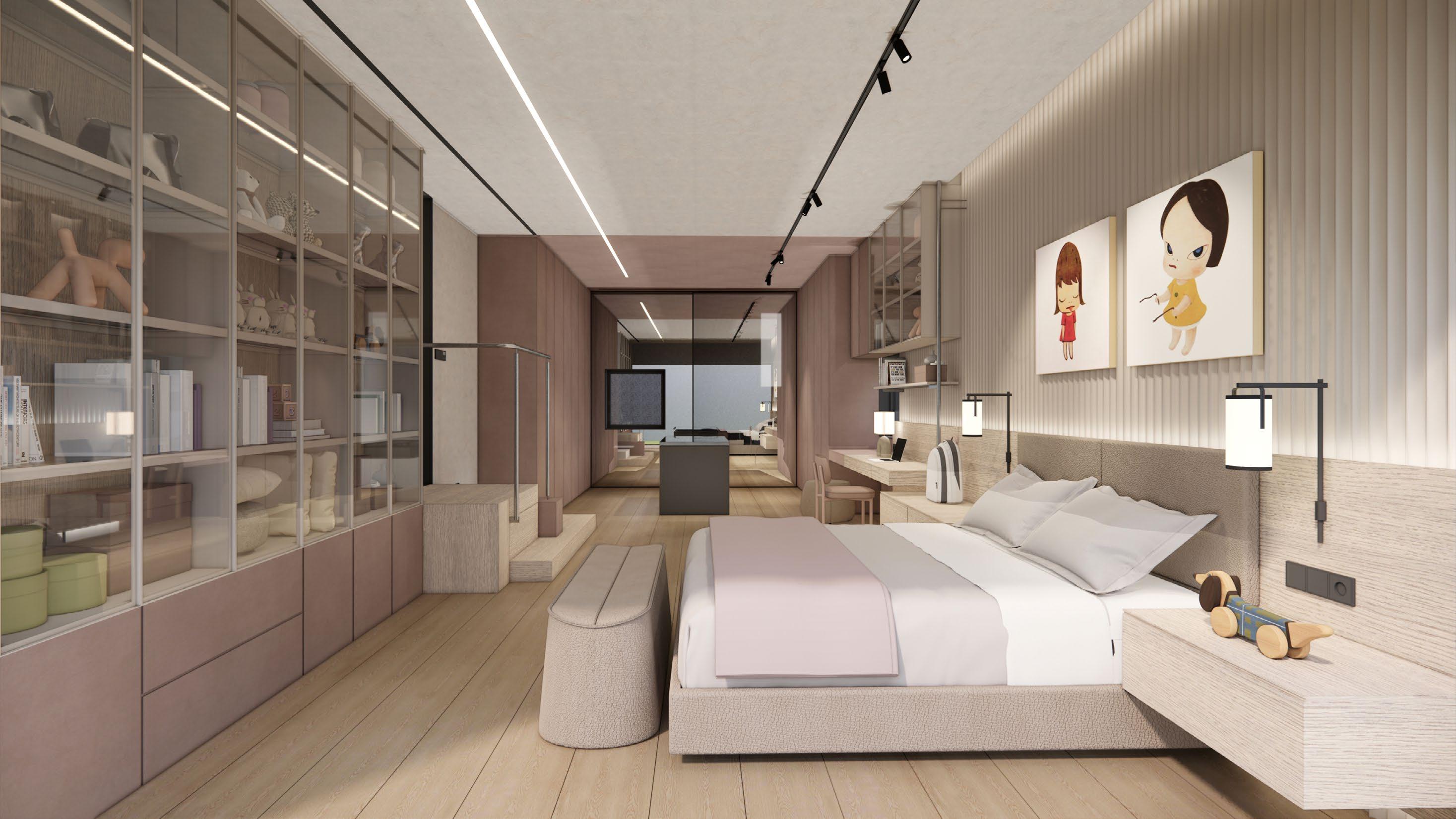 The enjoyment space of the living room is deliberately close to the swimming pool, providing a sensation of water and fun.