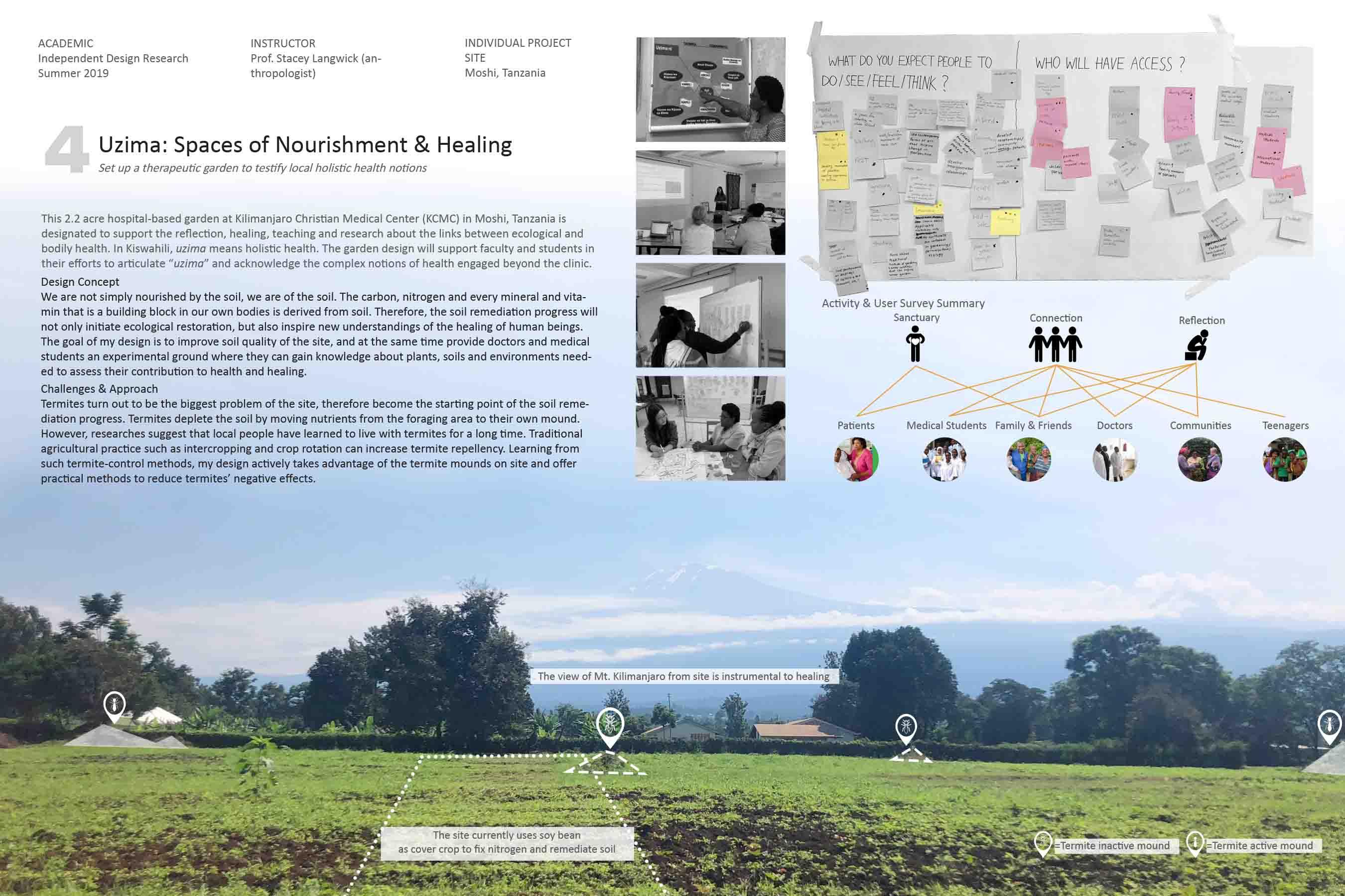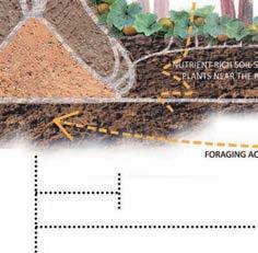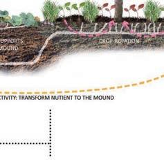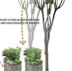 According to the studies on termite habit, the main foraging zone of termites is 10m-40m from the mound, where the soil suffers from nutrient depletion. However, the soil in the inner circle (within 10 meters from the mound) is free of foraging and stays nutrition-rich. The difference in soil condition results in completely different vegetation types. Therefore, my strategy is to create termite-repellent landscape in the outer circle, meanwhile set up symbiotic relationship between termite and plants in the inner circle.