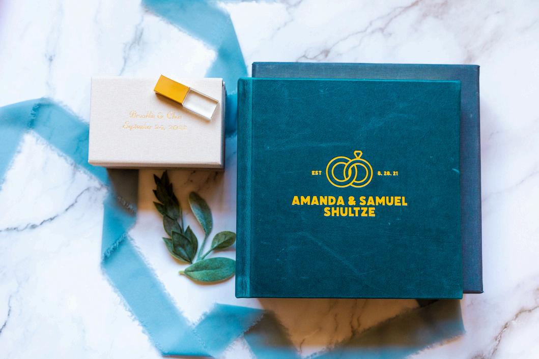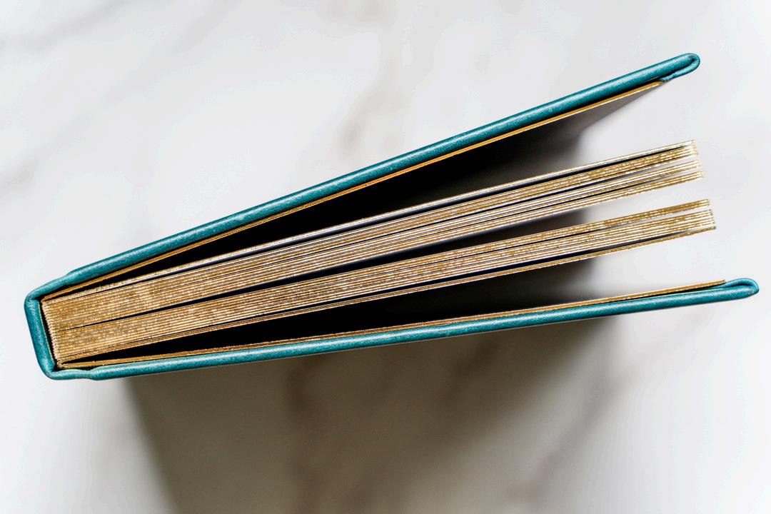 All albums include 20 spreads (40 pages), gilding (the pretty shiny stuff on the edges of the pages), and custom debossing on the cover, a graphite box for safe keeping, and a complimentary design by me