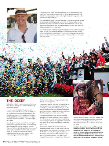 THE JOCKEY At the other end of the career spectrum is Irish hoop Oisin Murphy, although he is another who has long held dreams of glory. It seems only yesterday that Murphy spent his northern winter in Australia as a wide-eyed 18-yearold apprentice. That summer, a mere six years ago, Murphy rode 13 winners, including the Listed Bagot Handicap (2800m) at Flemington aboard the Nigel Blackiston-trained Outback Joe, a son of the mighty Let’s Elope. Now, Murphy is Europe’s tour de force, winning his first British champion jockey title in 2019 and adding races like the Japan Cup, the Dubai Turf, the Irish Champion Stakes and the Eclipse Stakes to his haul of 15 Group 1 wins. He has also returned to Australian shores for a runner-up finish to Magic Millions graduate Winx in her fourth and final Cox Plate victory, placing aboard Benbatl in 2018.