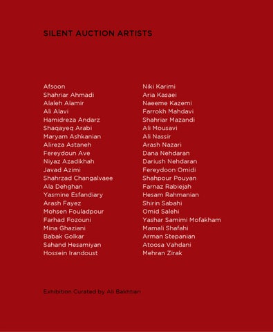 Afsoon Shahriar Ahmadi Alaleh Alamir Ali Alavi Hamidreza Andarz Shaqayeq Arabi Maryam Ashkanian Alireza Astaneh Fereydoun Ave Niyaz Azadikhah Javad Azimi Shahrzad Changalvaee Ala Dehghan Yasmine Esfandiary Arash Fayez Mohsen Fouladpour Farhad Fozouni Mina Ghaziani Babak Golkar Sahand Hesamiyan Hossein Irandoust