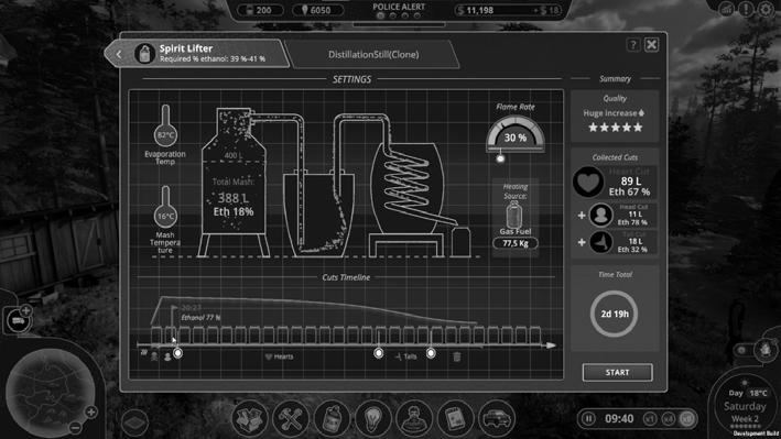 który po upadku swojego imperium przenosi się do małej miejscowości, by zacząć od zera. Dość rozbudowany system zarządzania pro cesem produkcji księżycówki pozwala zbudo wać swoją pozycję od szaraczka, przygotowu jącego swój produkt w beczce, do lokalnego potentata branży alkoholowej. Przygotowy wanie kolejnych receptur wymaga dostoso wania licznych parametrów, by odtworzyć wzorzec danego gatunku alkoholu. Miłośni cy tabelek i wykresów będą zadowoleni.